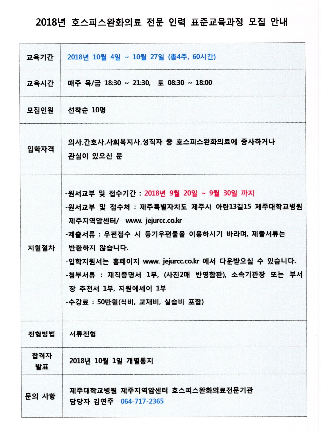 *신청 및 문의: 제주대학교병원 암센터 호스피스완화병동 김연주 사회복지사 ( 717-2365 )
