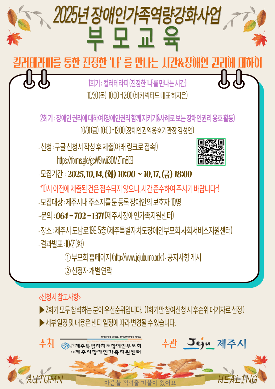 문의) 제주특별자치도장애인부모회부설 제주시장애인가족지원센터