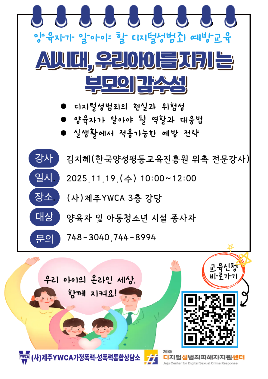 (사)제주 YWCA 가정폭력 성폭력 통합상담소에서 운영하는 '제주디지털성범죄피해자지원센터'에서는 양육자대상 디지털성범죄 예방교육을 진행하고자 합니다. 많은 교육신청 부탁드립니다.