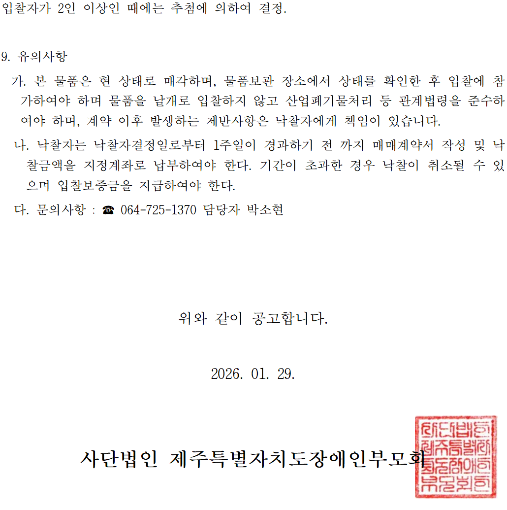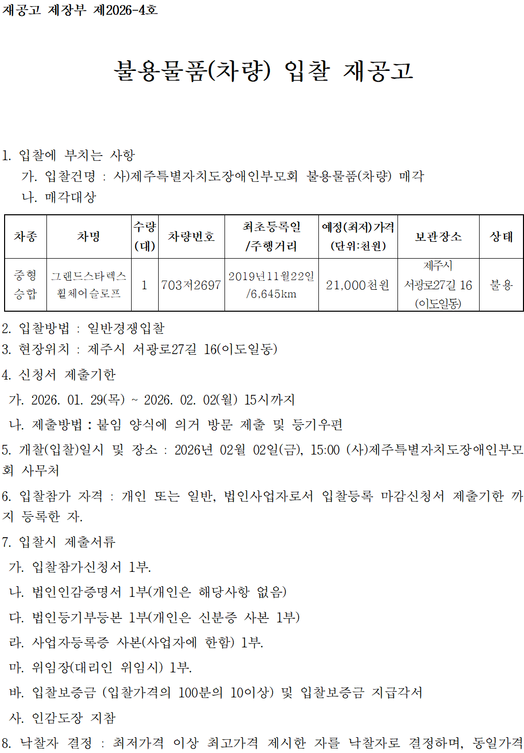 제주특별자치도장애인부모회 중고차량 매각 재공고