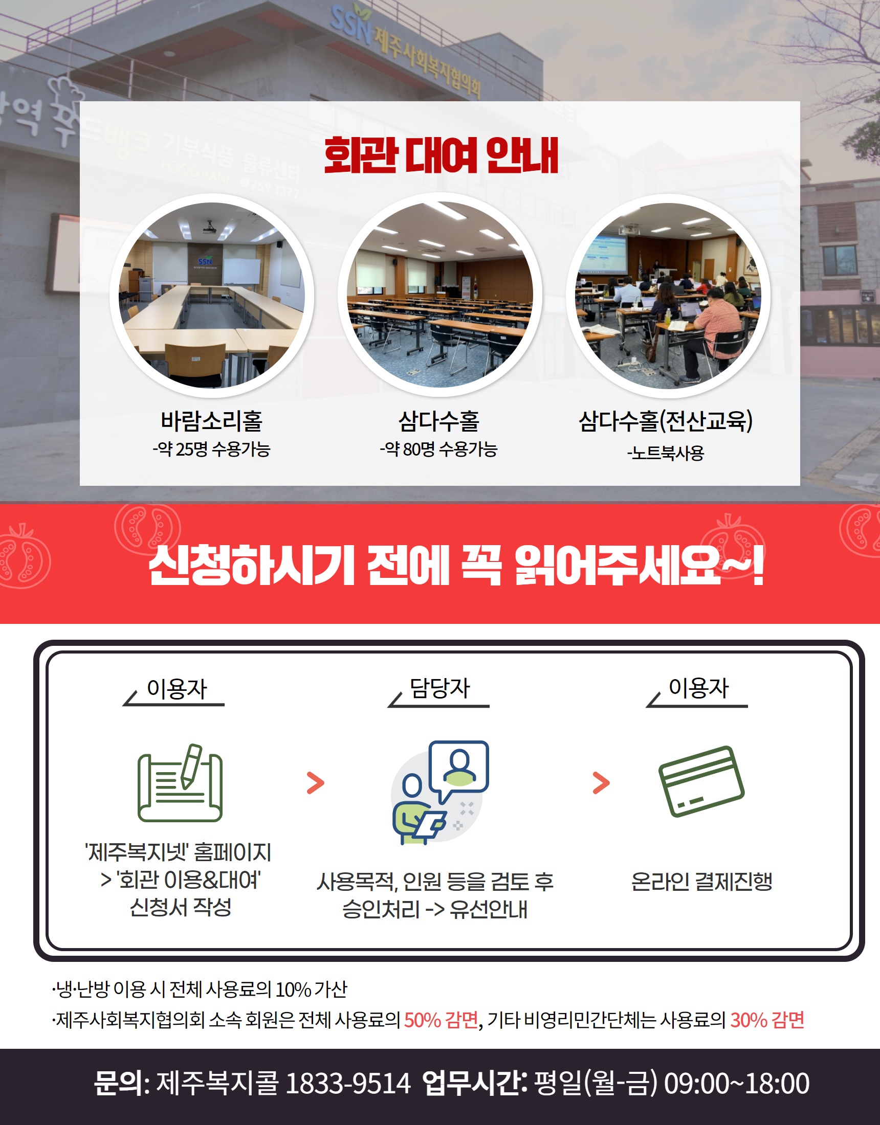 저희 제주사회복지협의회에서는 도내 각 기관 및 시설, 단체, 일반업체 등에서 각종 행사 및 교육프로그램을 진행하시는데 도움을 드리고자 회관 시설을 대여하고 있습니다.