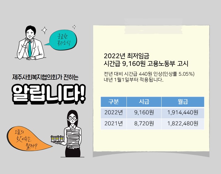 2022년도 최저임금이 9,160원으로 확정되었습니다.
