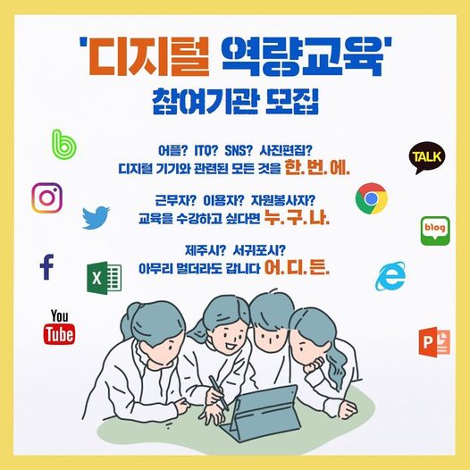 강사가 직접 기관으로 방문해 다양한 종류의 디지털 교육(SNS, 어플, 엑셀, 유튜브 등등)을 무료(!)로 진행하며,
