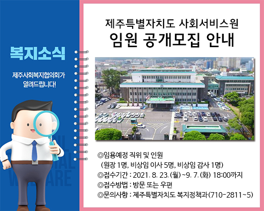 제주특별자치도 사회서비스원(이하 제주사회서비스원) 임원에 대한 공개모집이 시작되면서 제주사회서비스원 설립에 속도가 붙기 시작했습니다.