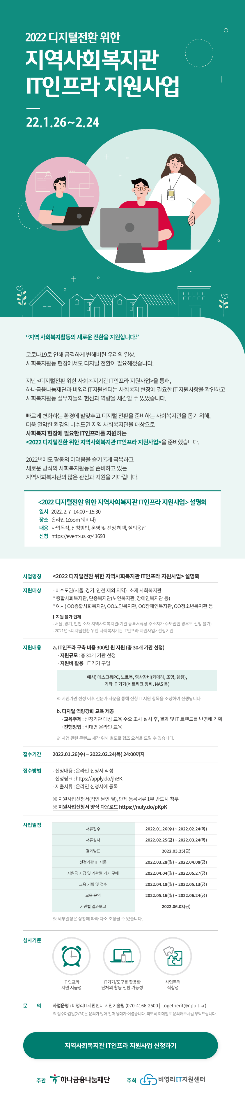 ※ 이미지 클릭시 '(사)비영리IT지원센터(2022 디지털전환 위한 지역사회복지관 IT인프라 지원사업 안내)' 사이트로 이동합니다.