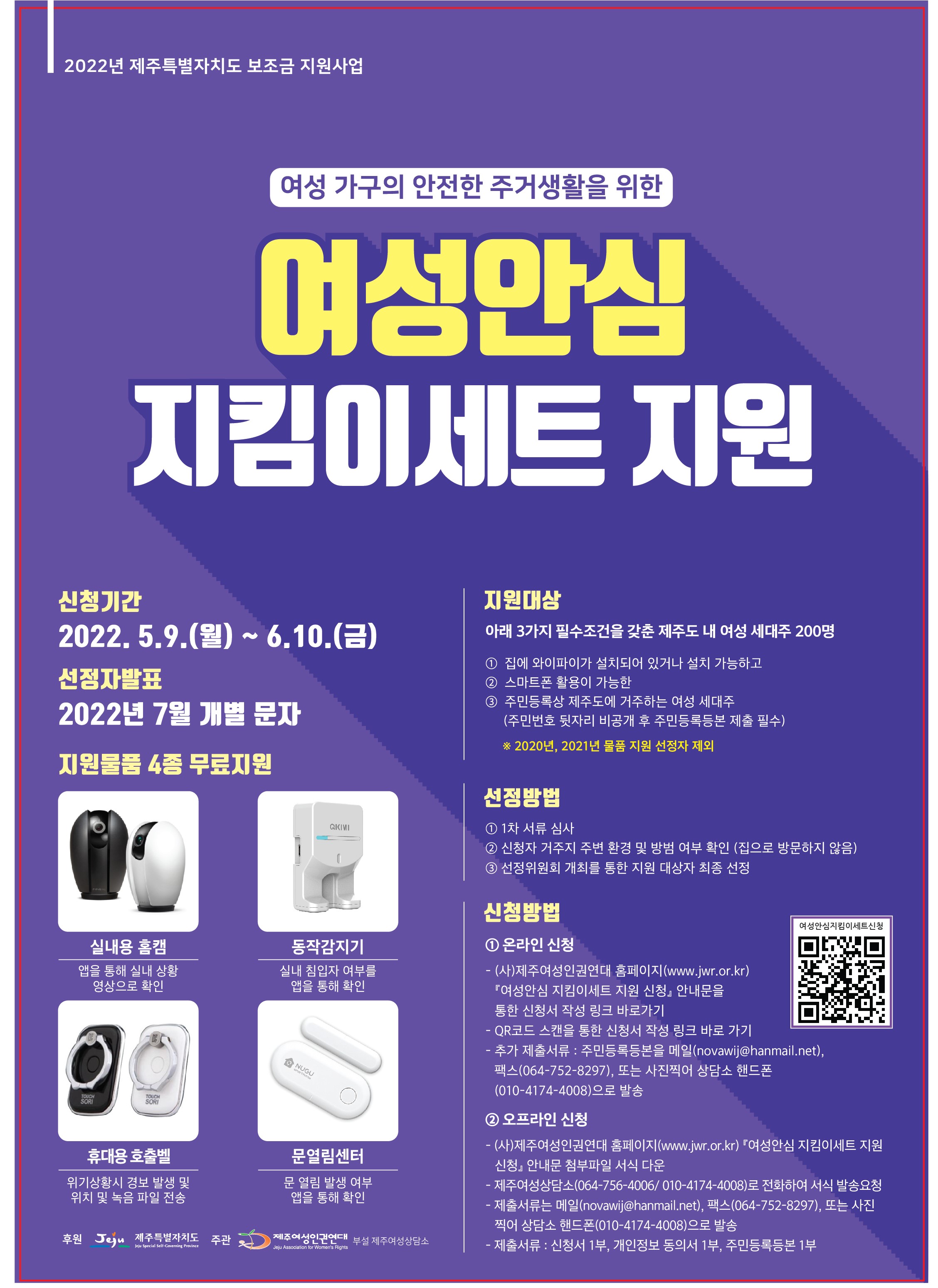 - (사)제주여성인권연대 홈페이지(www.jwr.or.kr) 「여성안심 지킴이세트 지원 신청」 안내문을 통한 신청서 작성 링크 바로가기
