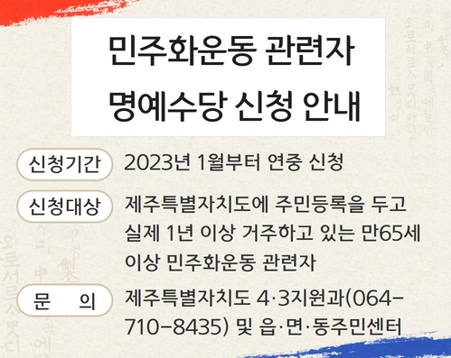 ○ 신청대상 : 제주특별자치도에 주민등록을 두고 실제 1년 이상 거주하고 있는 만65세 이상 민주화운동 관련자