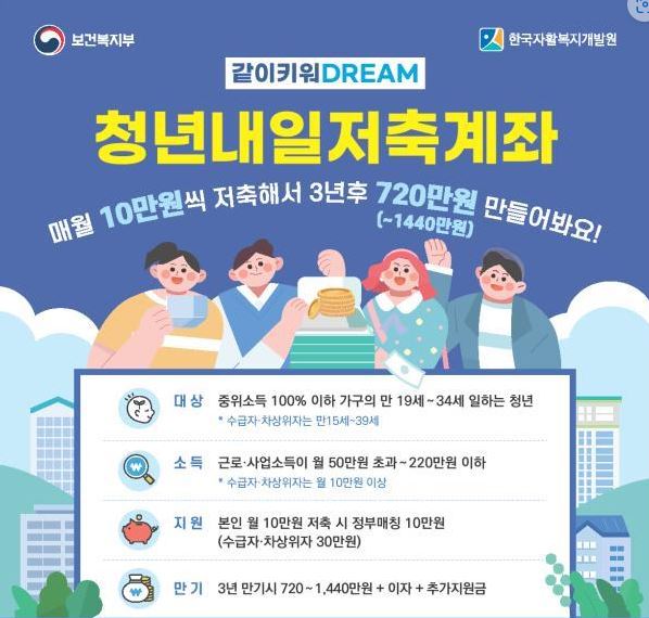 ❍ 지원대상 : 일하는 만 19세 이상부터 만 34세 이하인 가구 중 재산 2억원 이하인 청년으로 근로·사업 소득이 월 50만원 초과~220만원 이하, 청년이 속한 가구의 소득이 기준 중위소득 100% 이하여야 가입 가능