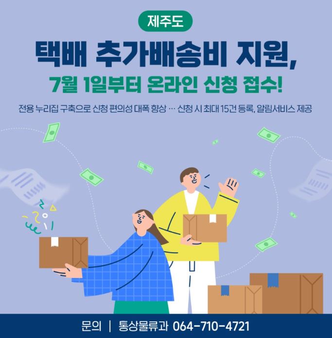 ❍ 신청방법 : 온라인(제주택배추가배송비지원 (jeju.go.kr)) 신청 및 읍.면.동 주민센터 방문신청