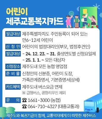 ❍ 발급대상 : 제주특별자치도에 주민등록이 되어 있는 만6~12세 어린이