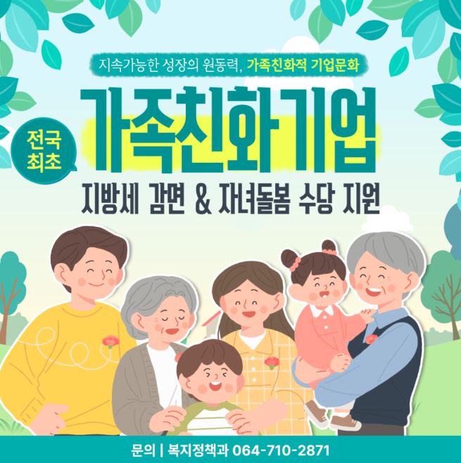 - 세금 감면 : 가족친화인증을 받은 제주 중소기업은 사업용 부동산 취득세 25% 감면, 주민세 면제(사업소분.종사자분 모두)