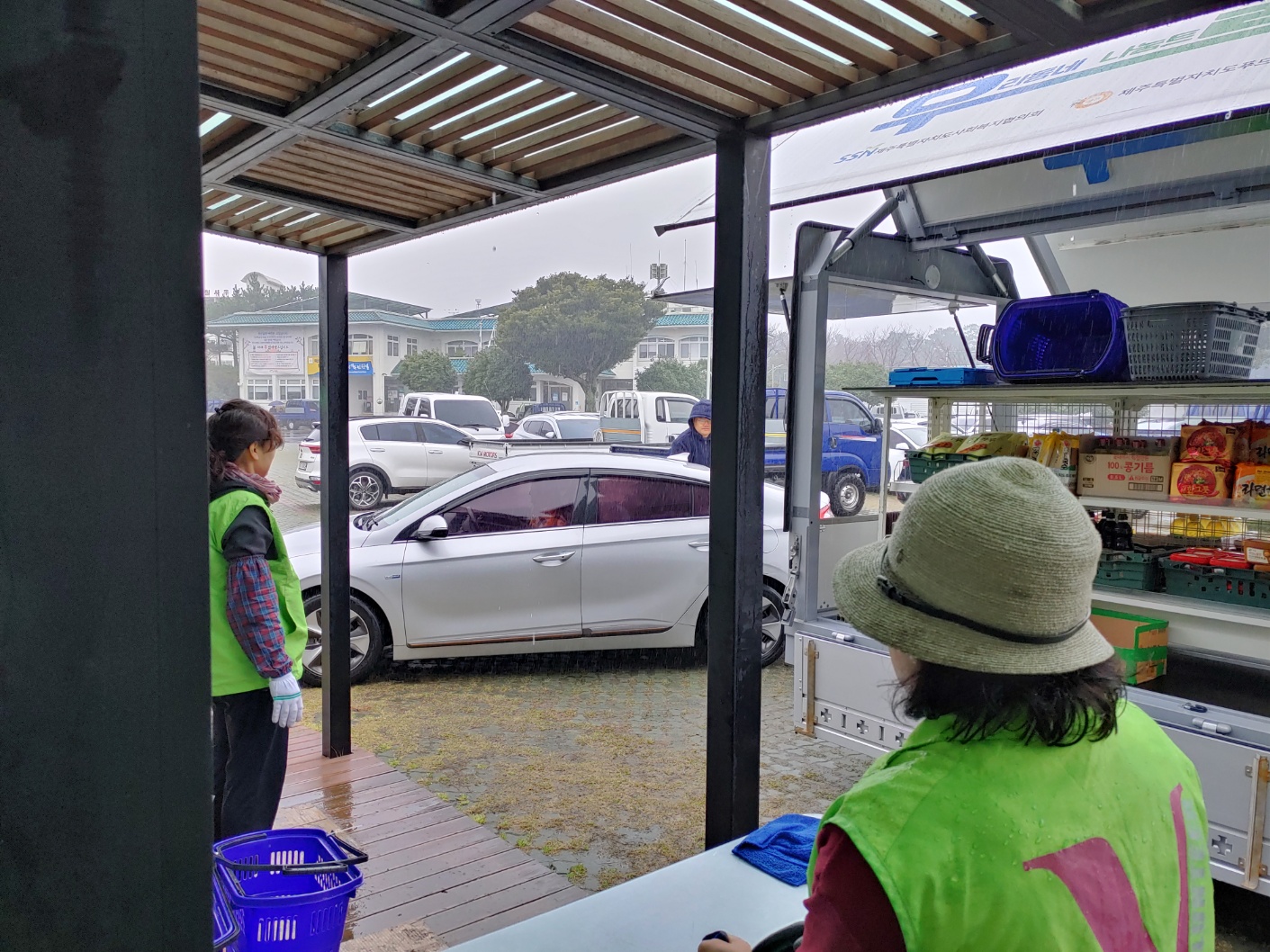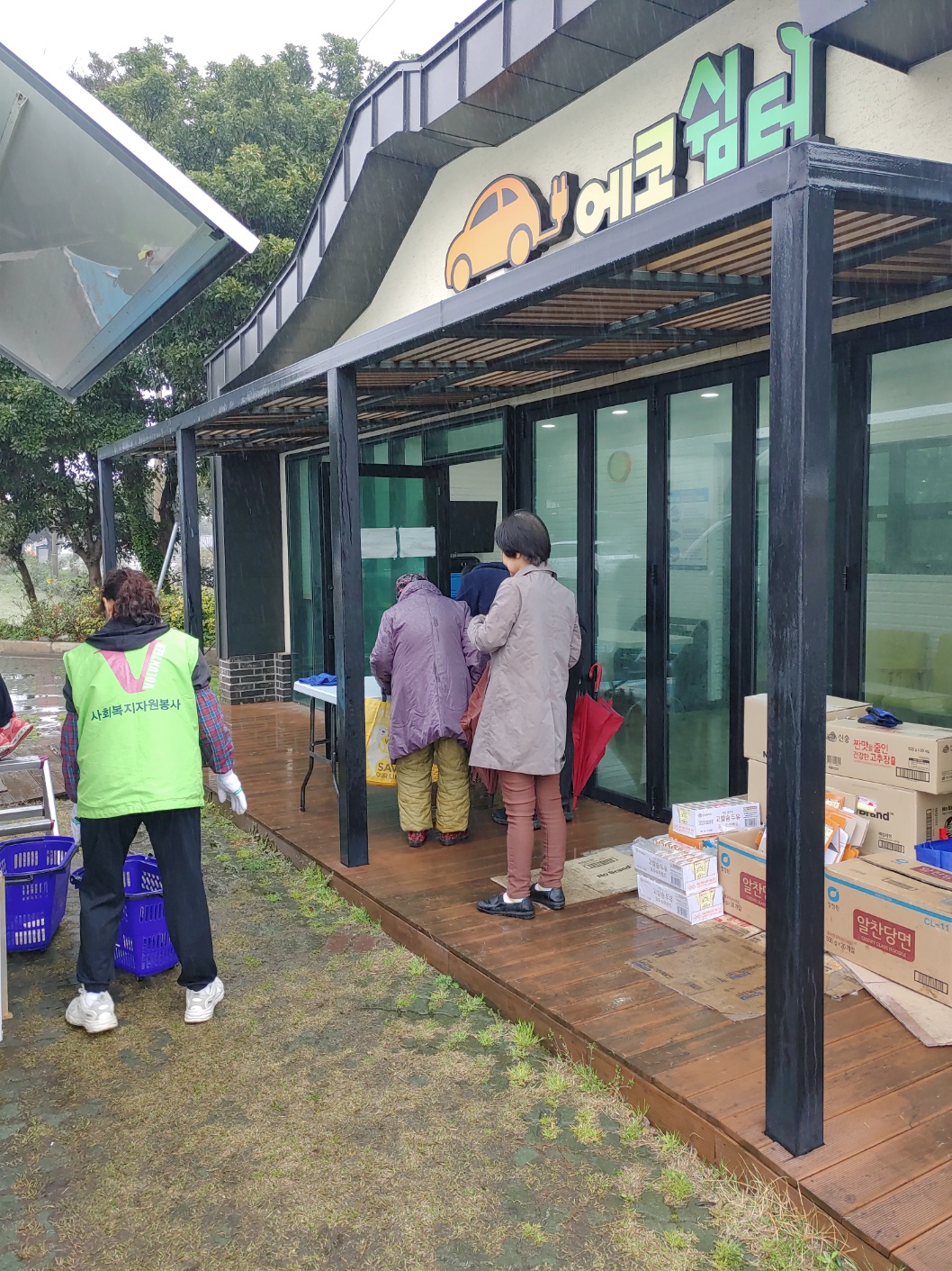 몸이 불편한 분이 차에서 내릴 수 없으시자 선생님이 다가가셔서 원하시는 물품을 직접