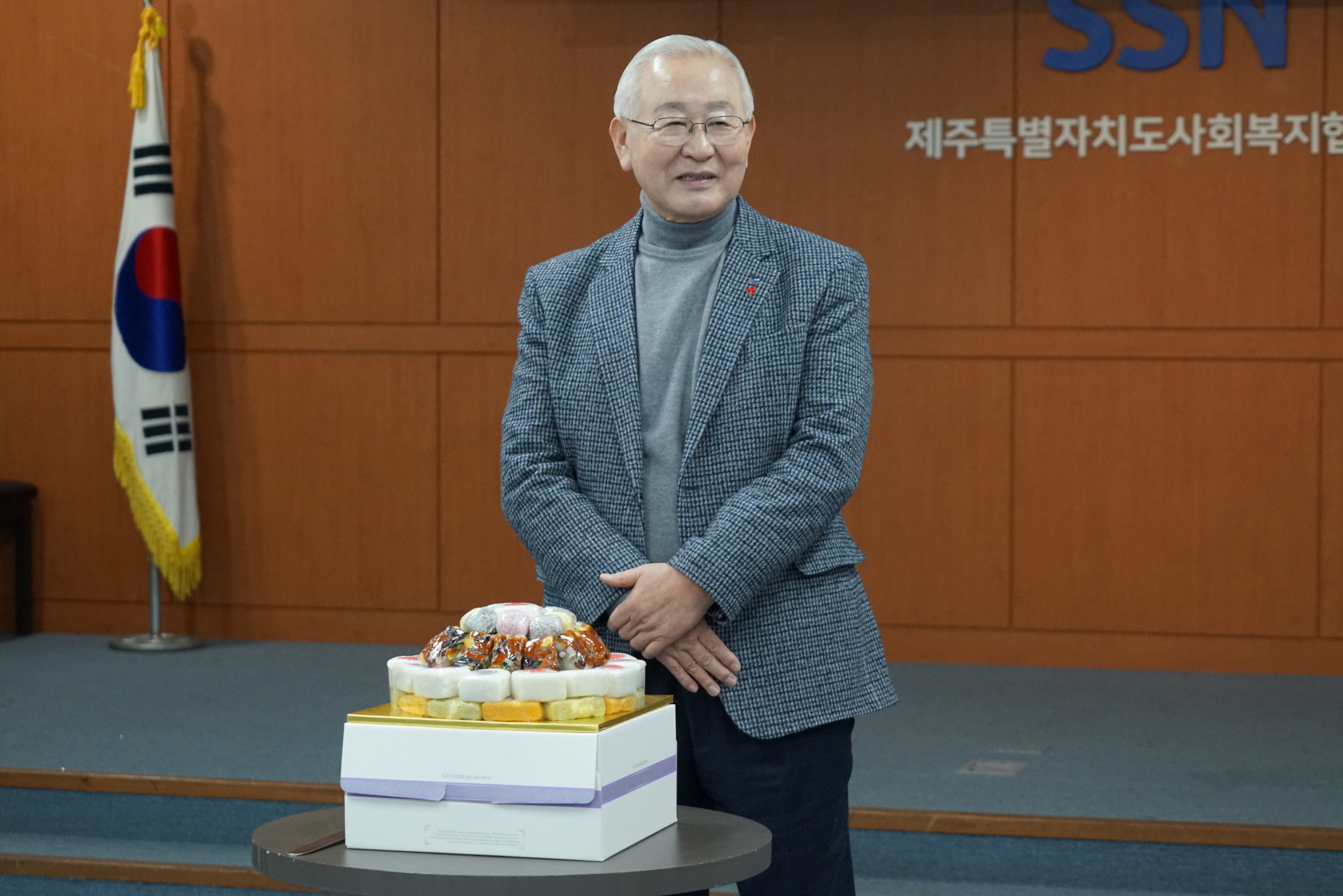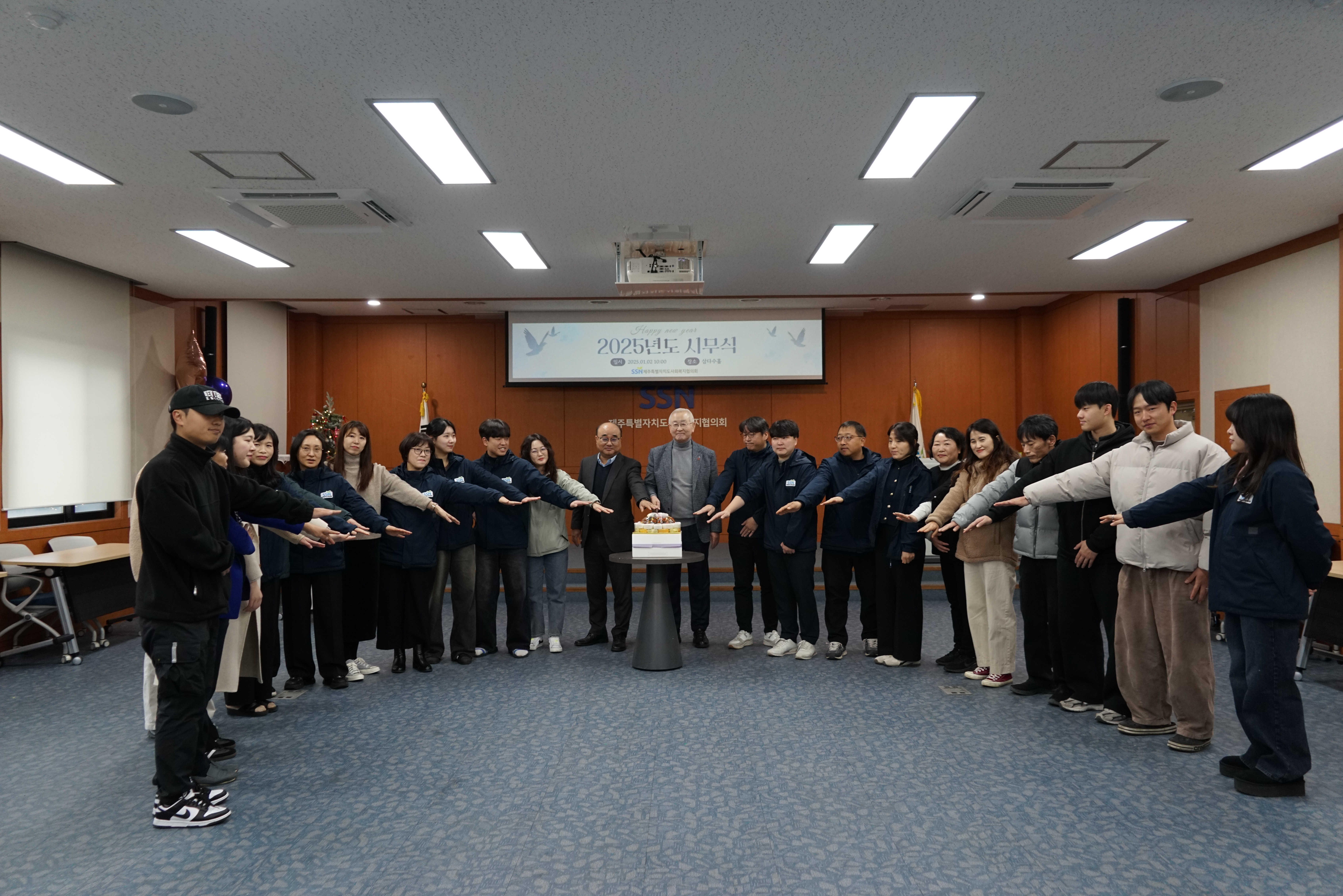 2025년 새해, 제주도사회복지협의회 직원들이 고승화 회장님과 함께 따뜻한 덕담을 나누며 화기애애한 분위기 속에서 새해를 맞이했습니다. 🌅🙂