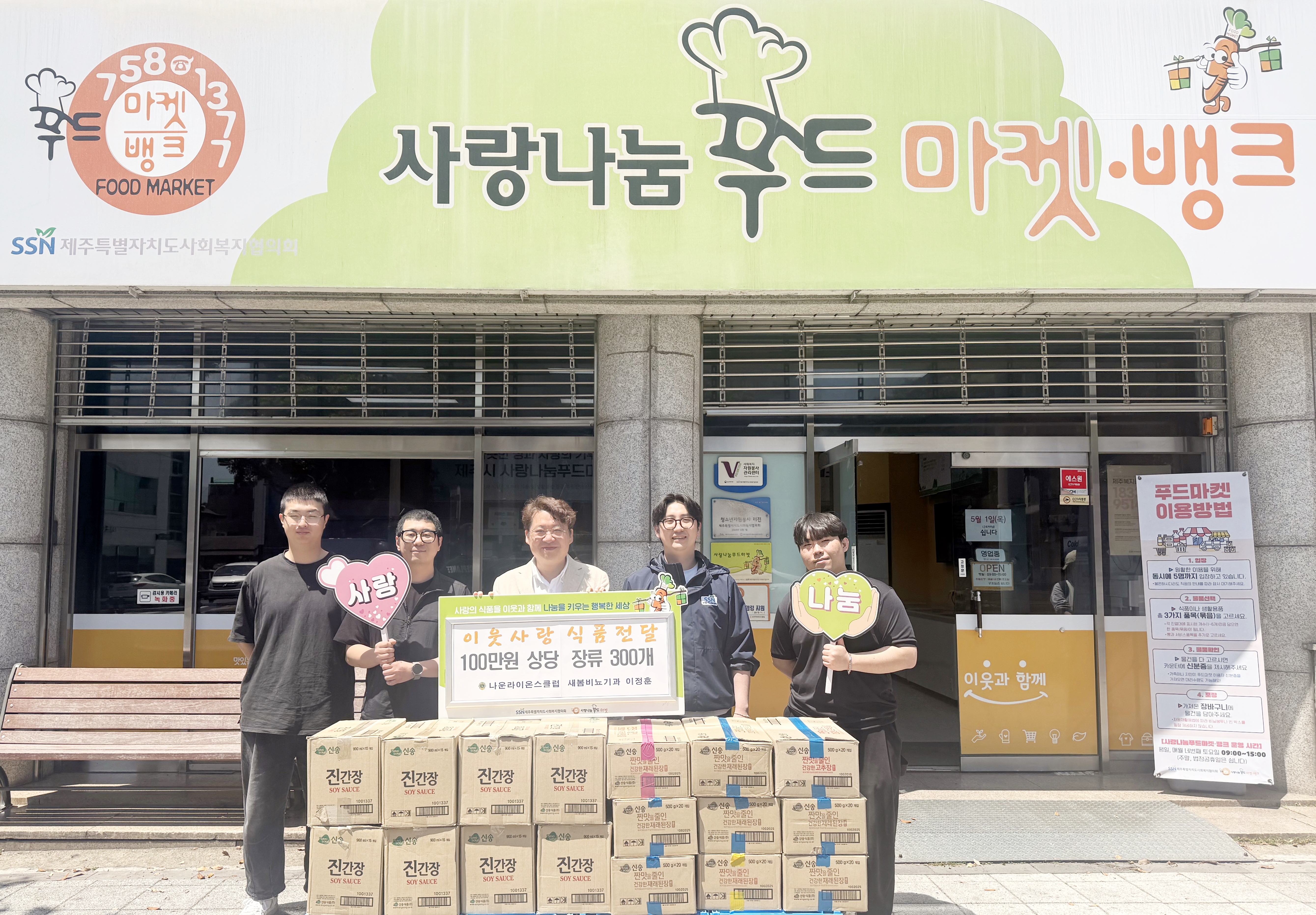 지난 4월 29일, 나운라이온스클럽 회원 이정훈(새봄비뇨기과 원장)은 우리협의회(회장 고승화)에서 운영하는 사랑나눔푸드마켓·뱅크 100만원 상당의 된장, 간장 등의 장류 300개 전달해주셨습니다.