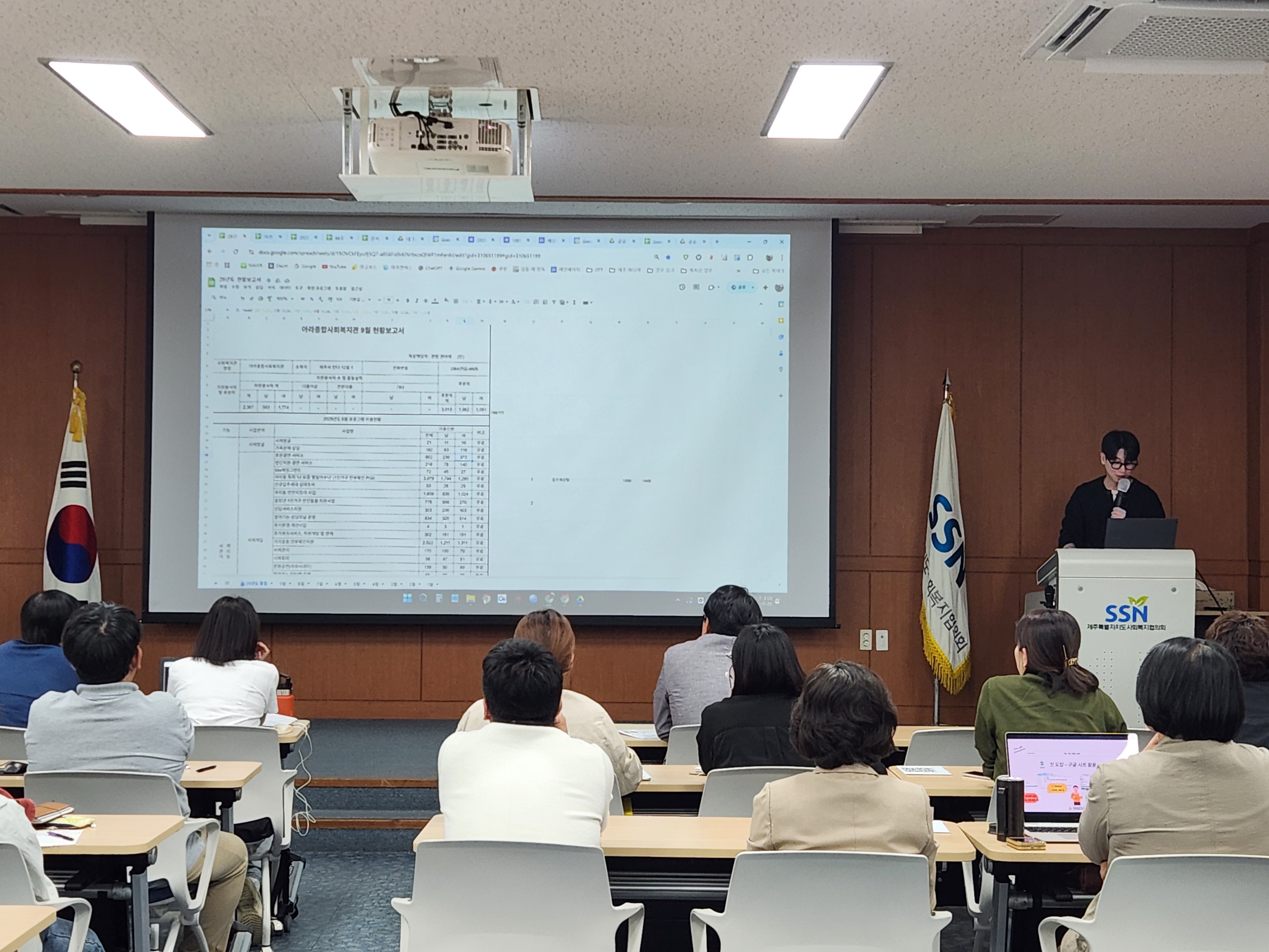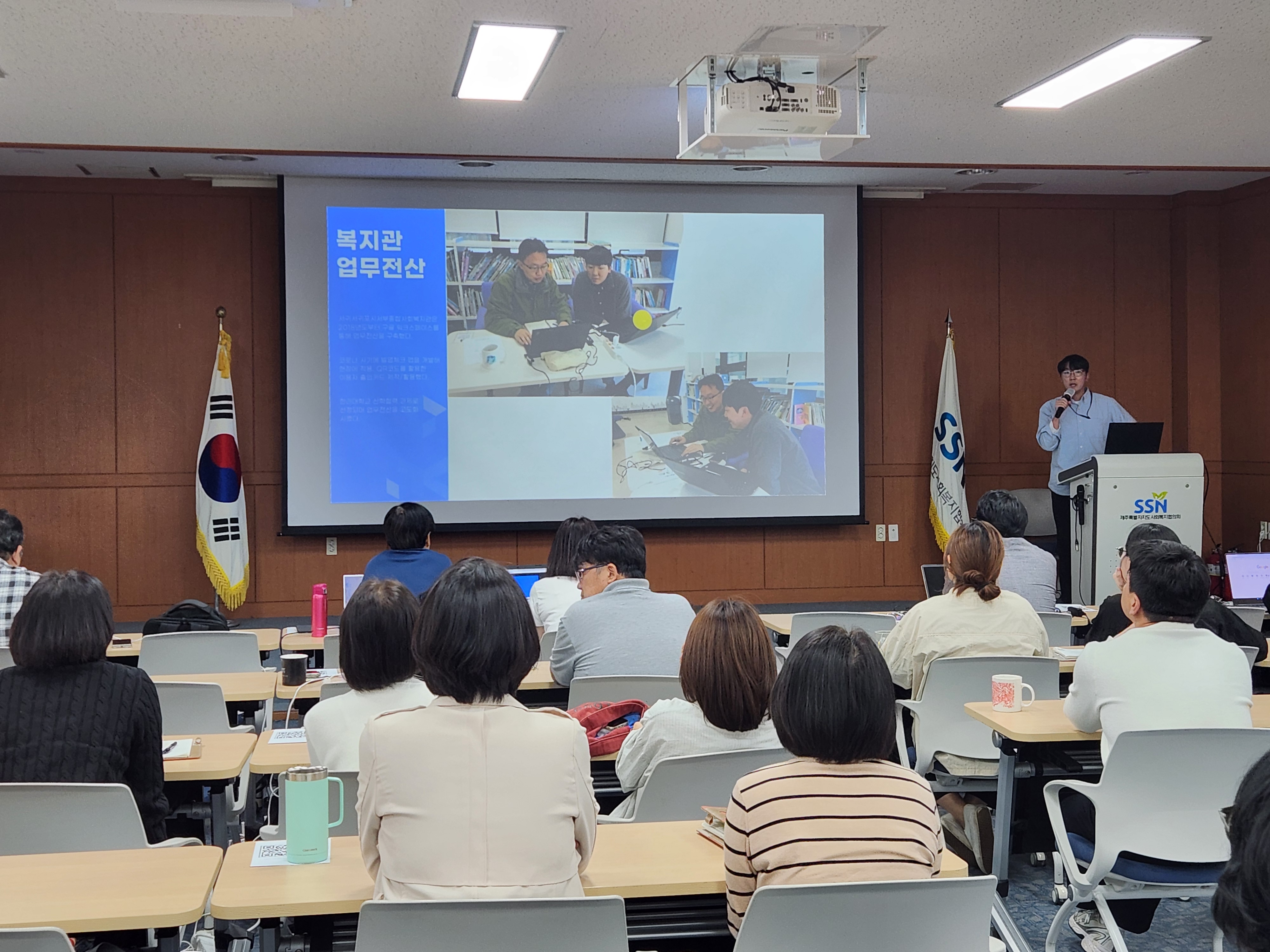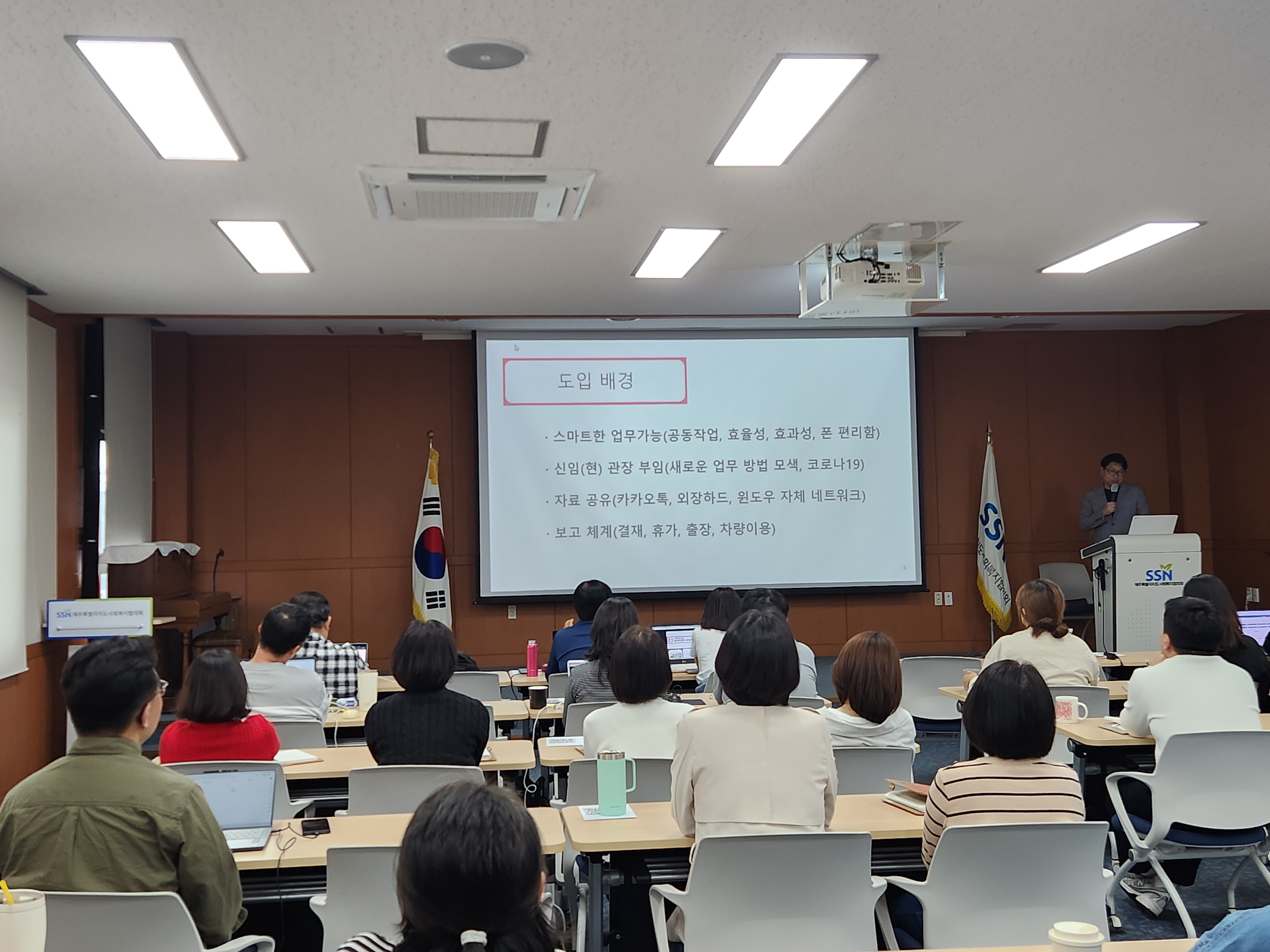 먼저 김종원 대표님(소셜프리즘)께서 '스마트 워크란 무엇인가?'를 주제로 강의를 진행해주셨고, 이후 도내 3개 종합사회복지관(아라종합사회복지관, 동제주종합사회복지관, 서귀포시서부종합사회복지관)의 활용 사례와 더불어 도외 기관들의 사례도 간략히 소개되었습니다.