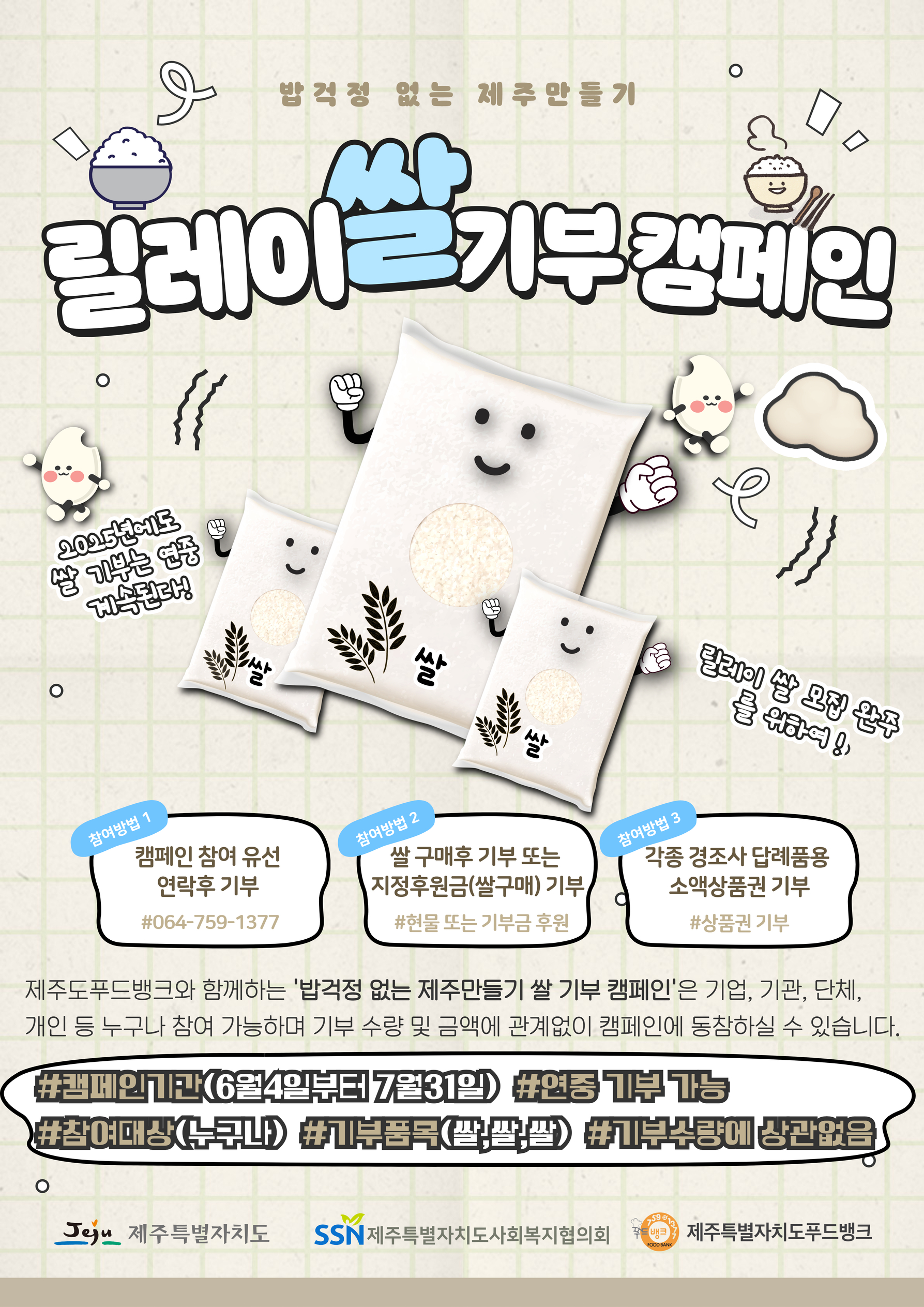 지난해에 이어 금년에도『2025 밥걱정 없는 제주만들기 – 릴레이 쌀 기부 캠페인』을 시작합니다.