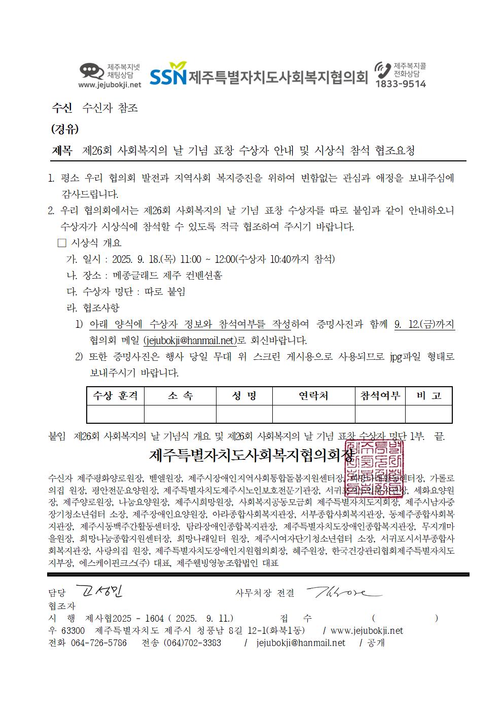 제26회 사회복지의 날 기념 표창 수상자 안내 및 시상식 참석 협조요청