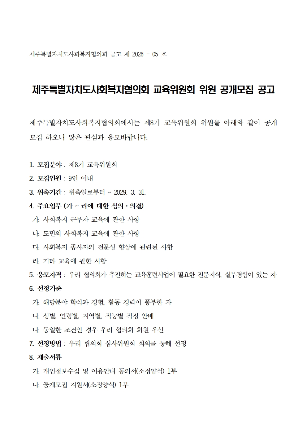 제주특별자치도사회복지협의회 교육위원회 위원 공개모집 공고
