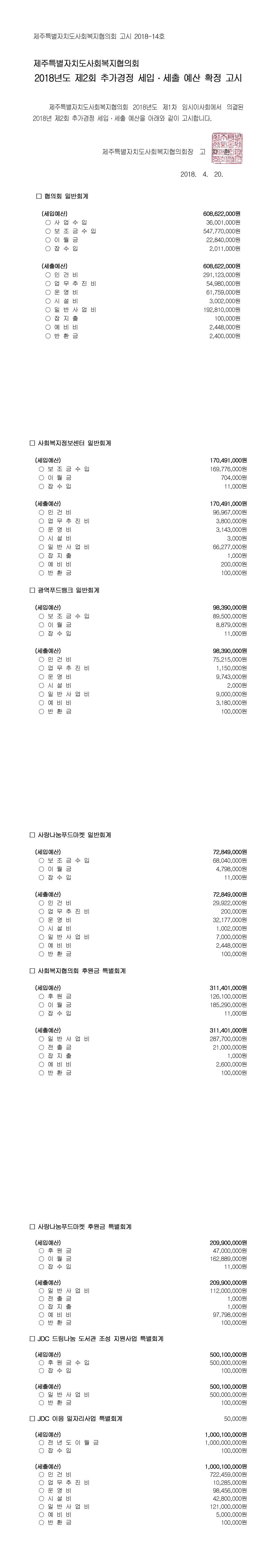 2018년도 제2회 추가경정 세입세출 예산고시