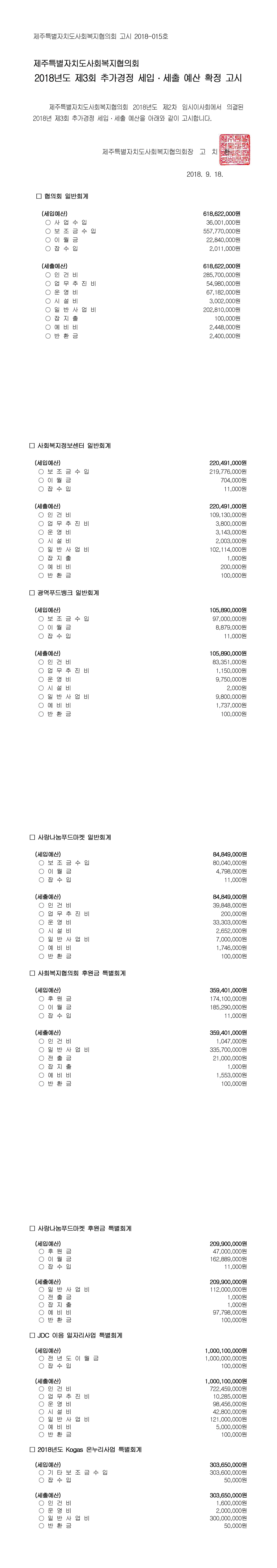 2018년도 제3회 추가경정 세입세출 예산고시
