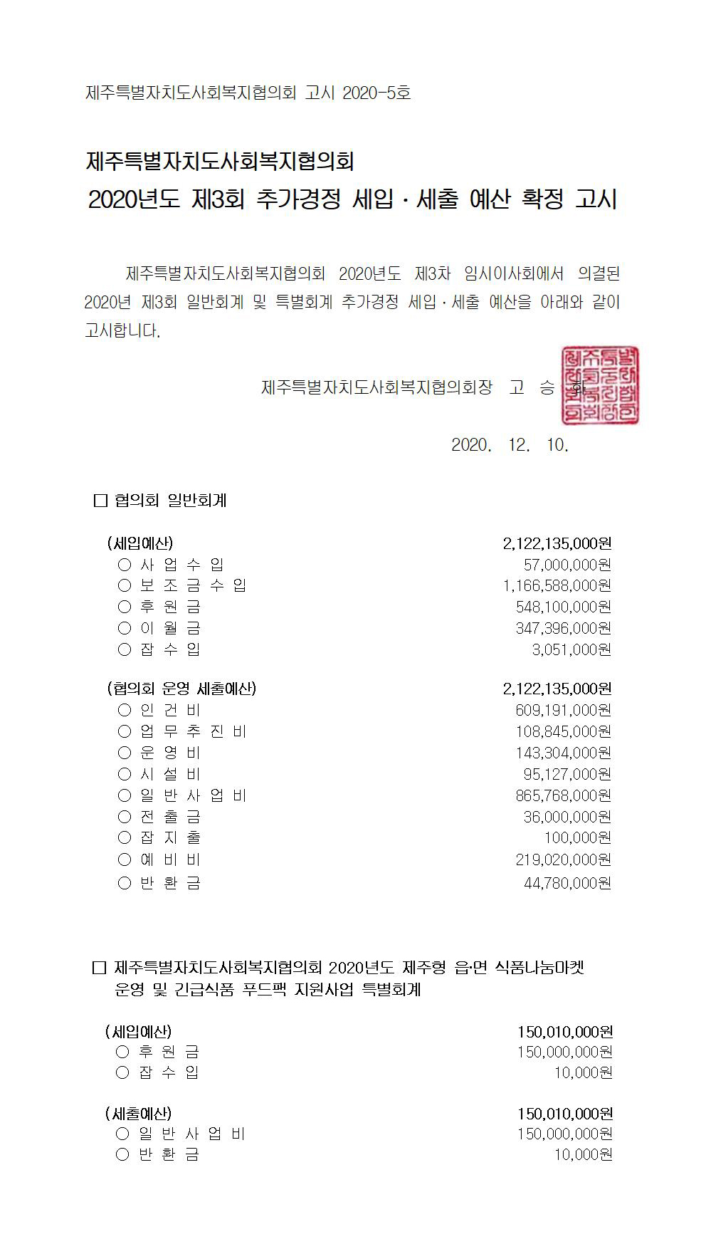 2020년도 제3회 추가경정 세입세출 예산고시