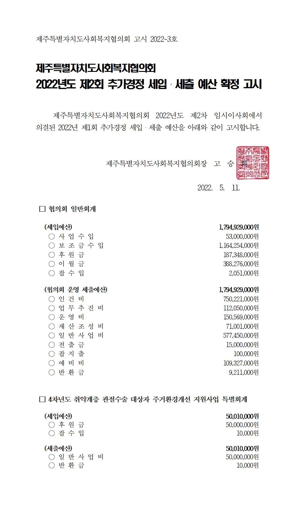 2022년도 제2회 추가경정 세입세출 예산고시