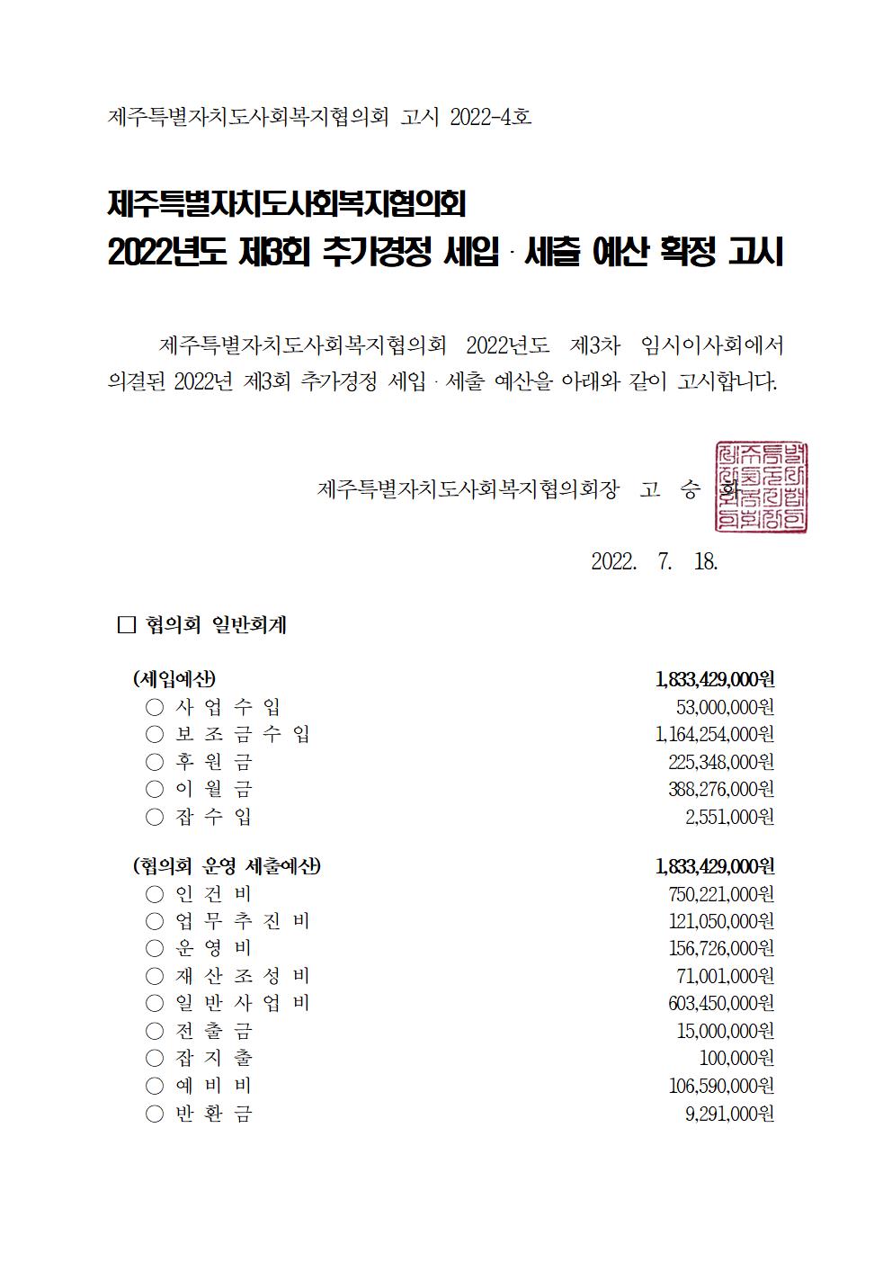 2022년도 제3회 추가경정 세입세출 예산고시