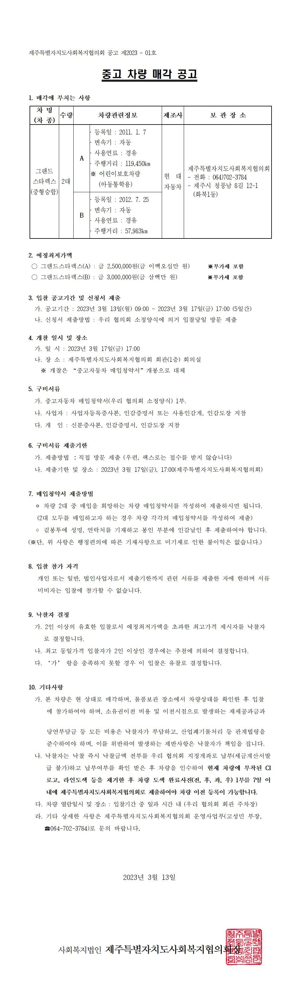 제주특별자치도사회복지협의회 중고차량 매각공고