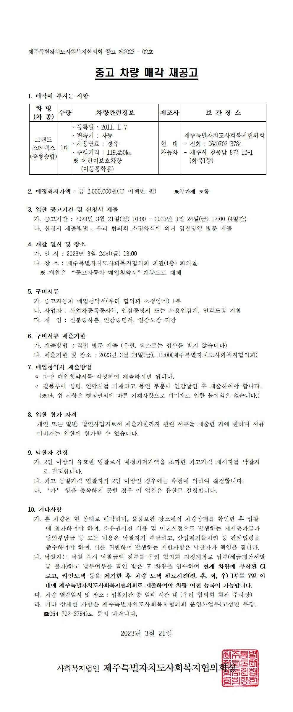 제주특별자치도사회복지협의회 중고차량 매각 재공고