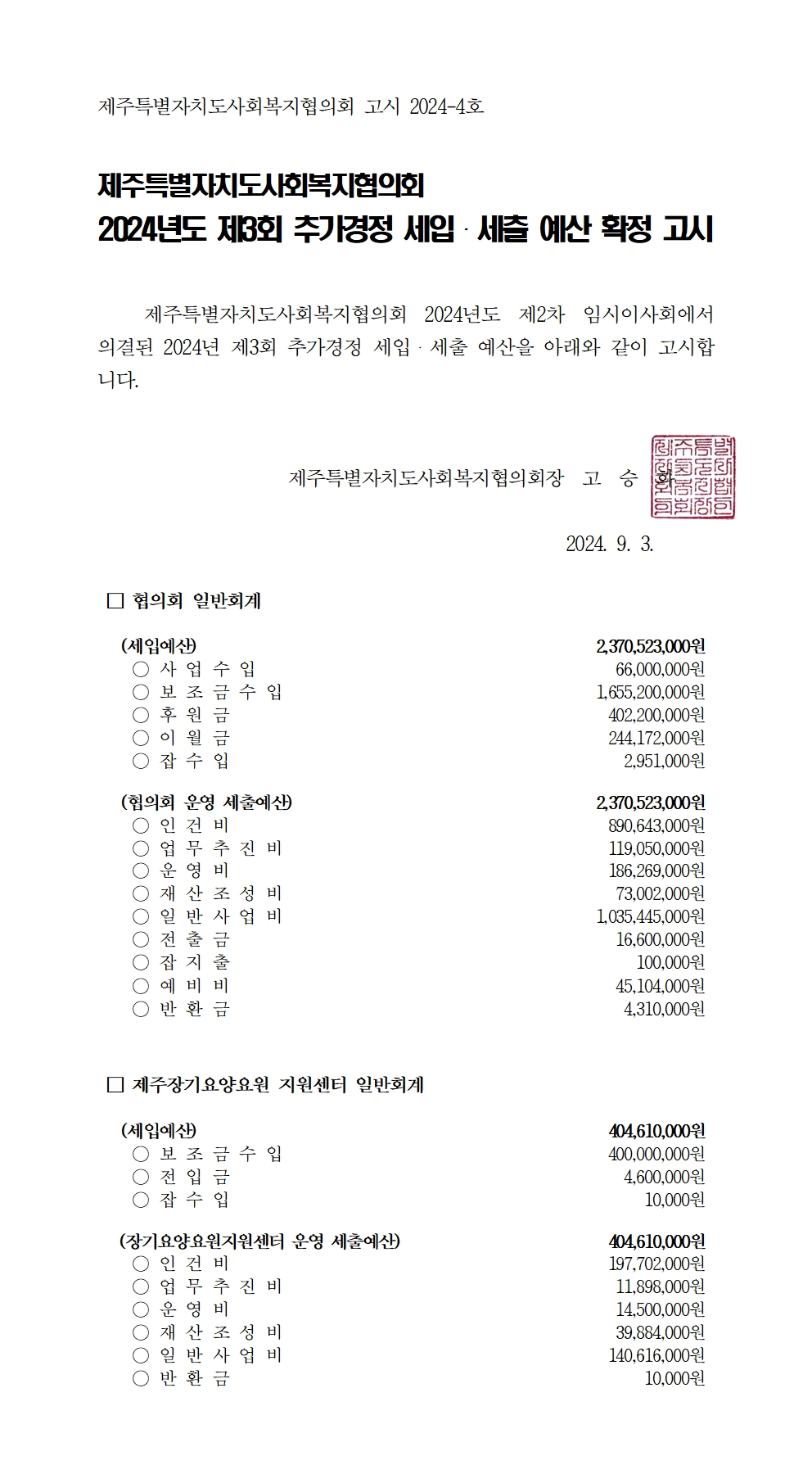2024년도 제3회 추가경정 세입세출 예산고시