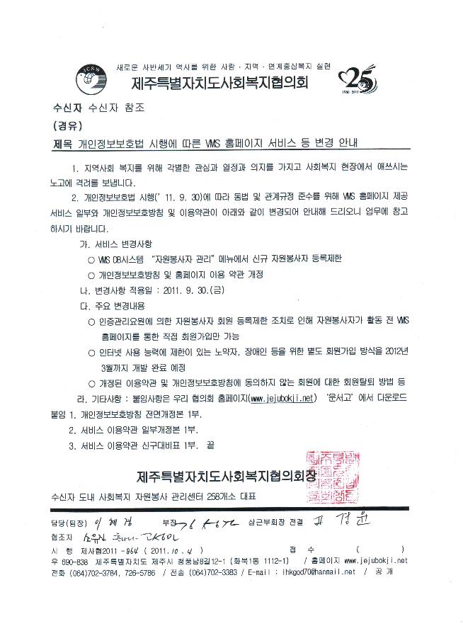 개인정보보호법 시행에 따른 VMS홈페이지 서비스 등 변경 안내
