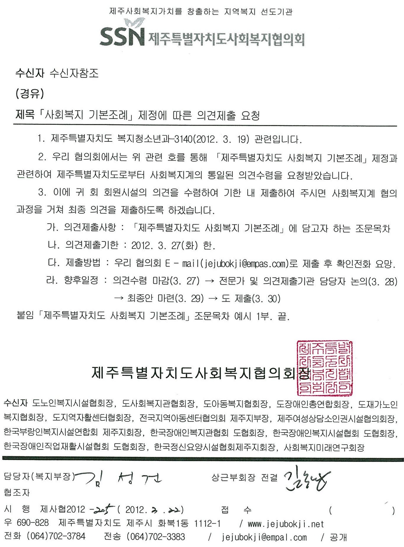 '사회복지 기본조례' 제정에 따른 의견제출 요청