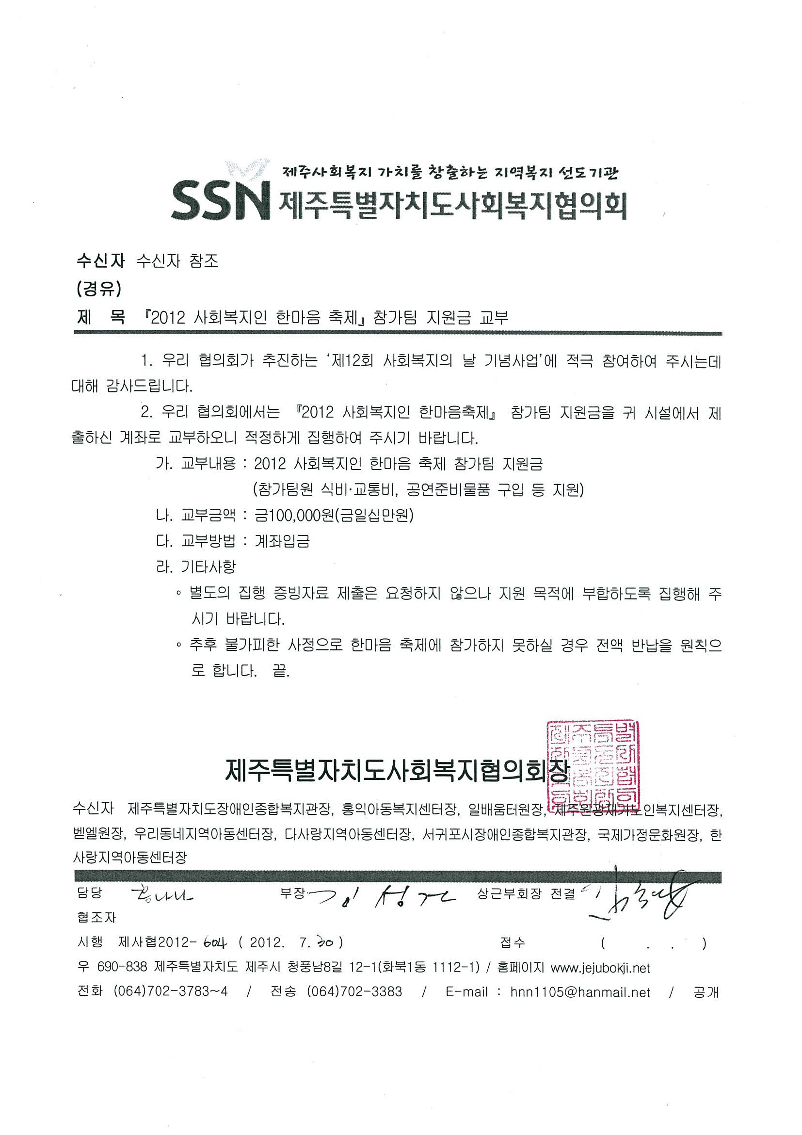 2012 사회복지인 한마음축제 참가팀 지원금 교부