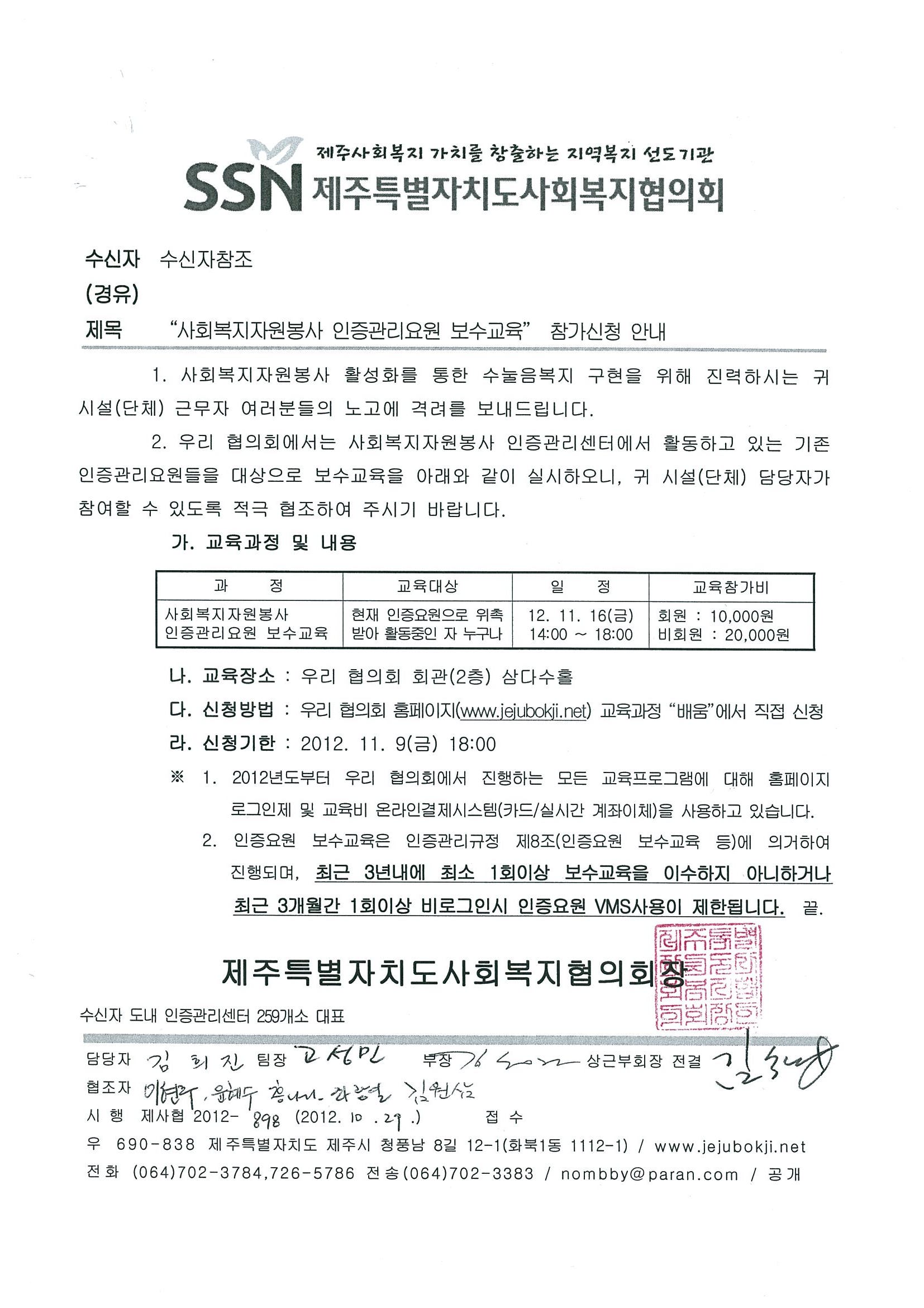 2012 하반기 사회복지자원봉사 인증관리요원 보수교육 참가신청 안내