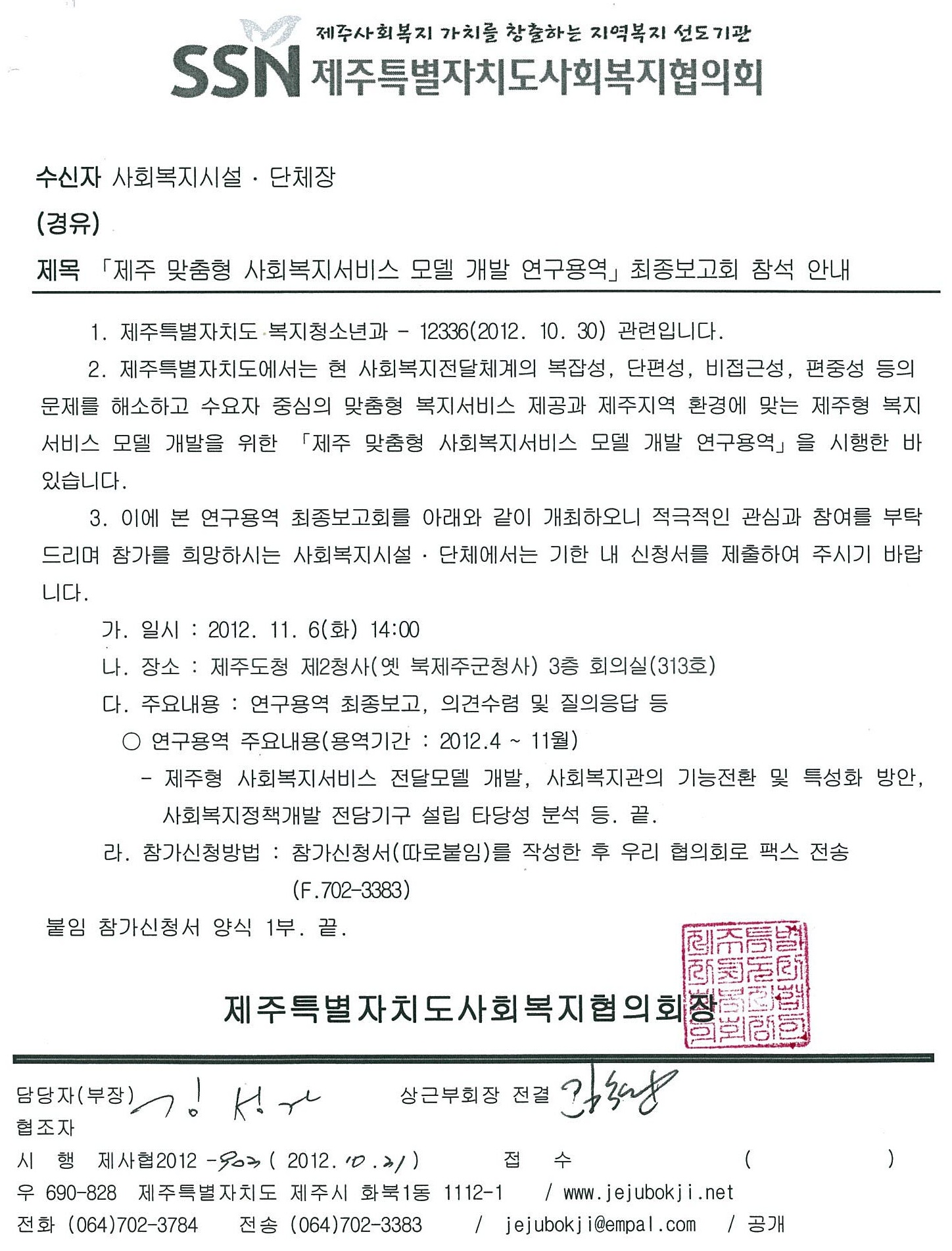 「제주 맞춤형 사회복지서비스 모델 개발 연구용역」최종보고회 참석 안내
