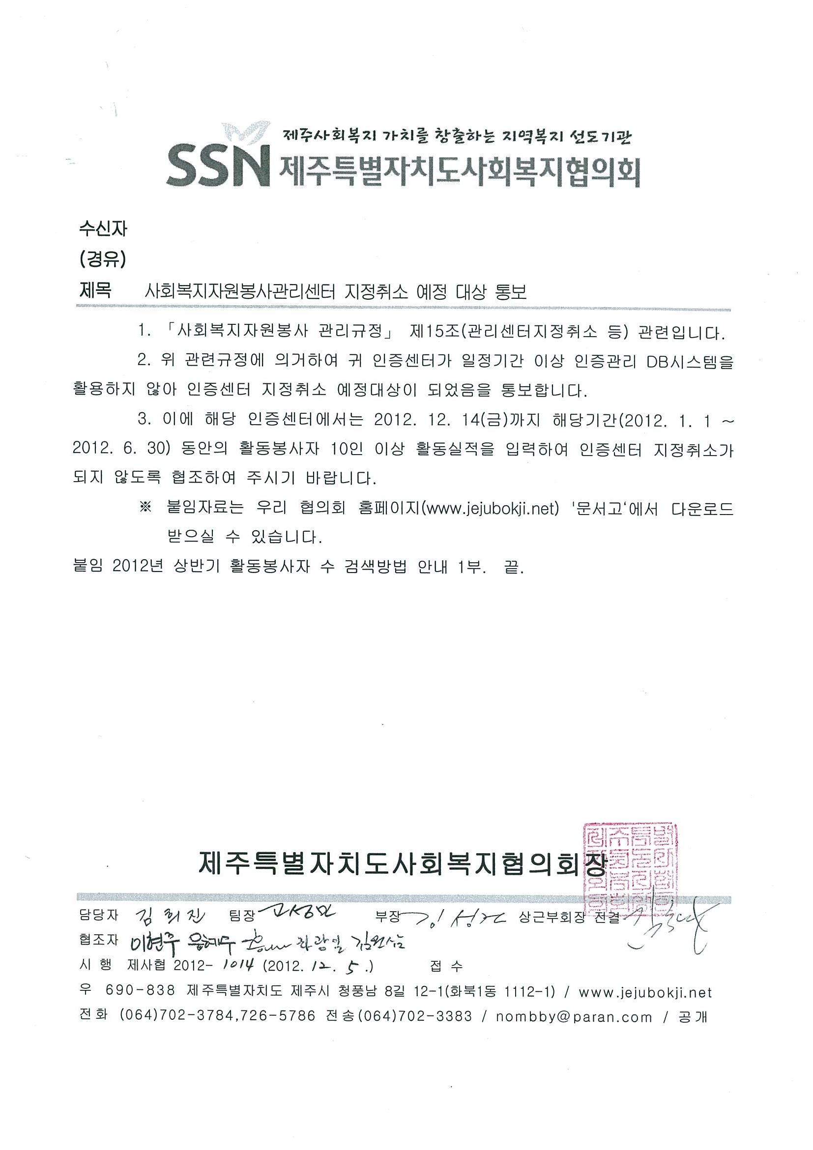 사회복지자원봉사관리센터 지정취소 예정 대상 통보