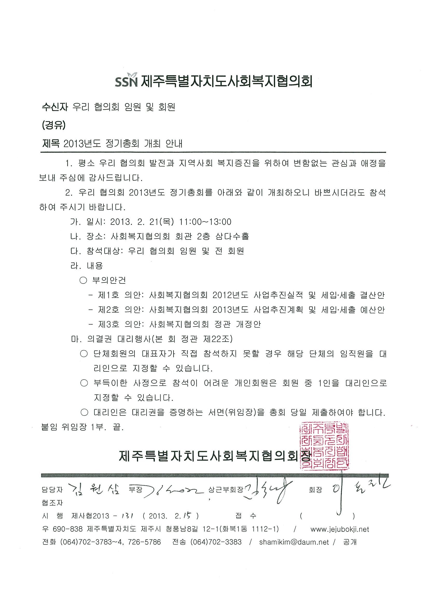 제주특별자치도사회복지협의회 2013년도 정기총회 개최 안내