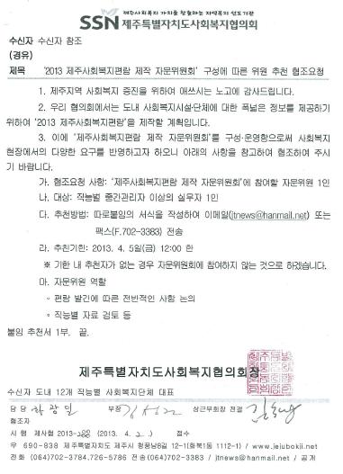 제주사회복지편람제작 자문위원회 구성에 따른 자문위원 추천 협조요청