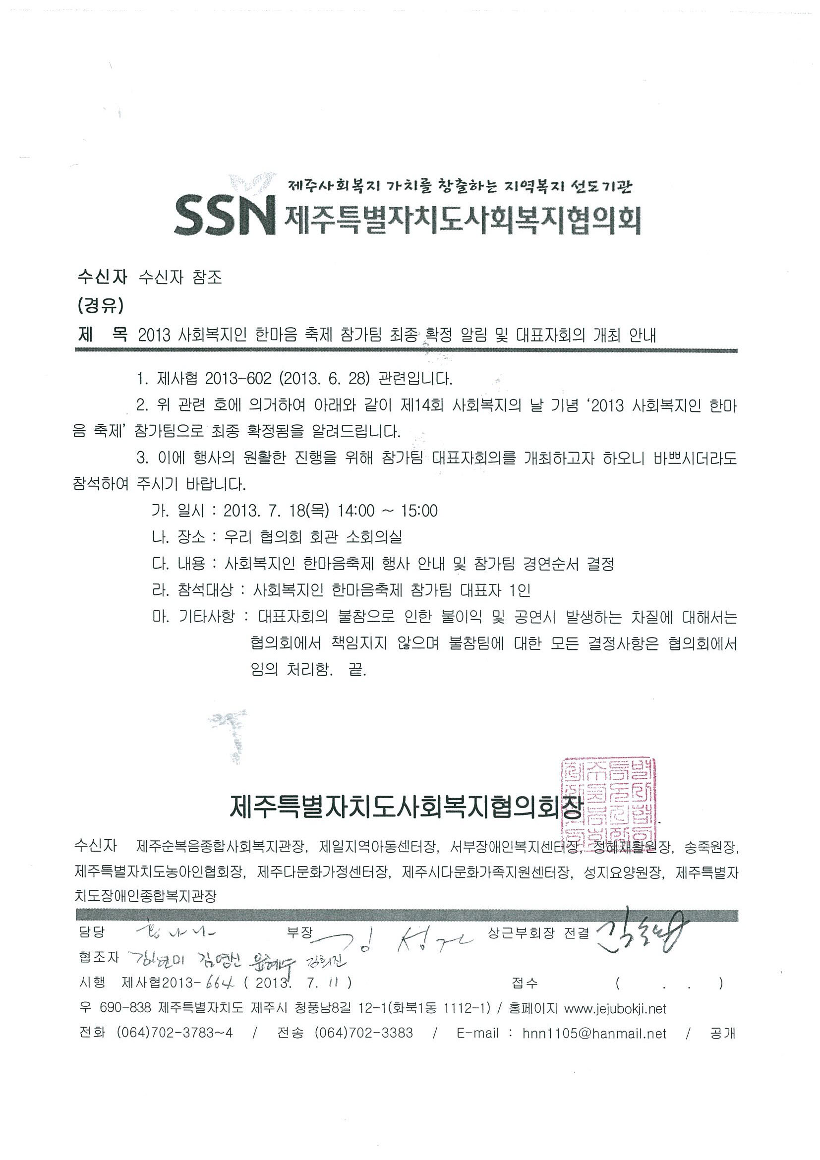 2013 사회복지인 한마음축제 참가팀 최종 확정 알림 및 대표자회의 개최안내