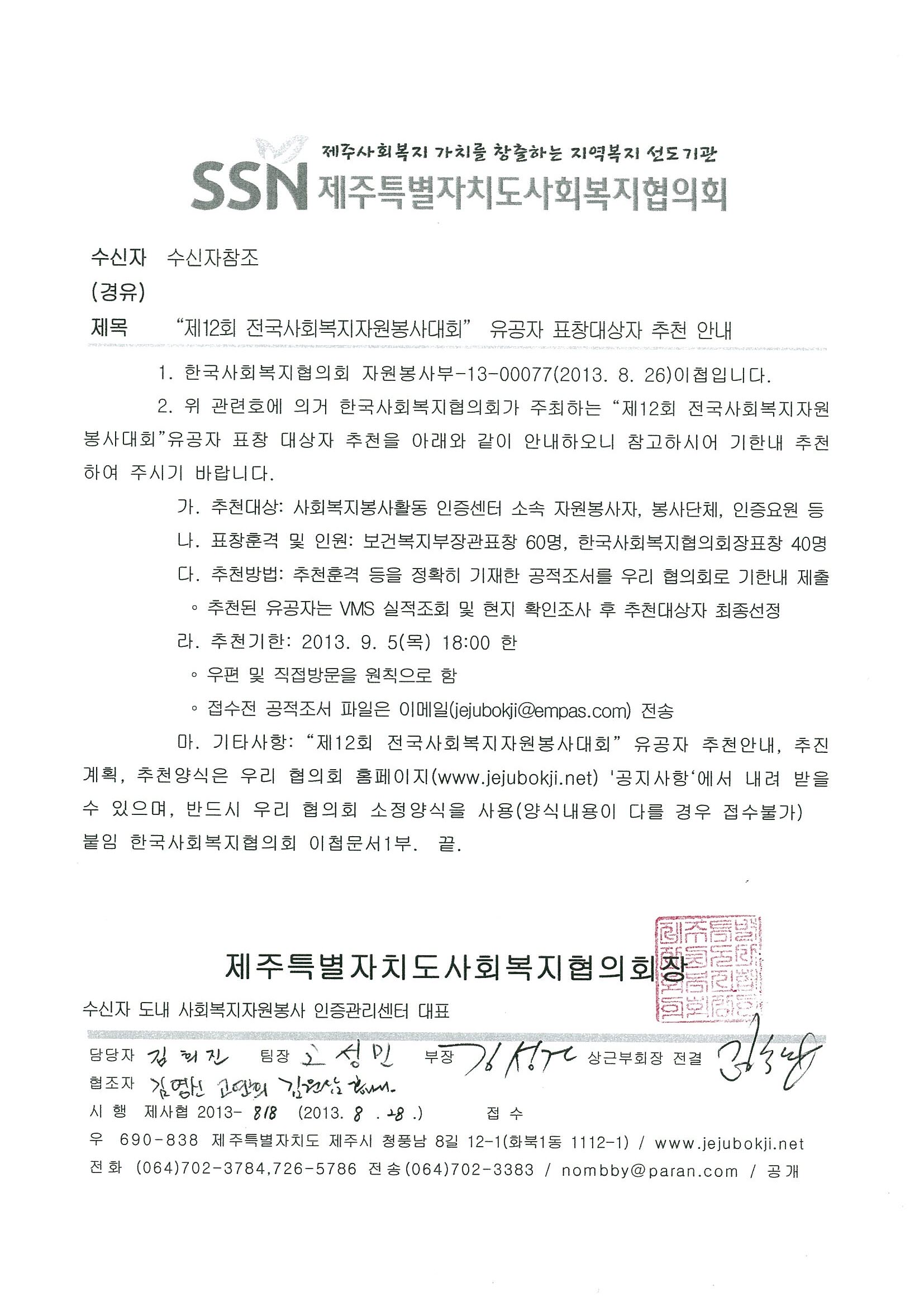 제12회 전국사회복지자원봉사대회 유공자 표창대상자 추천 안내