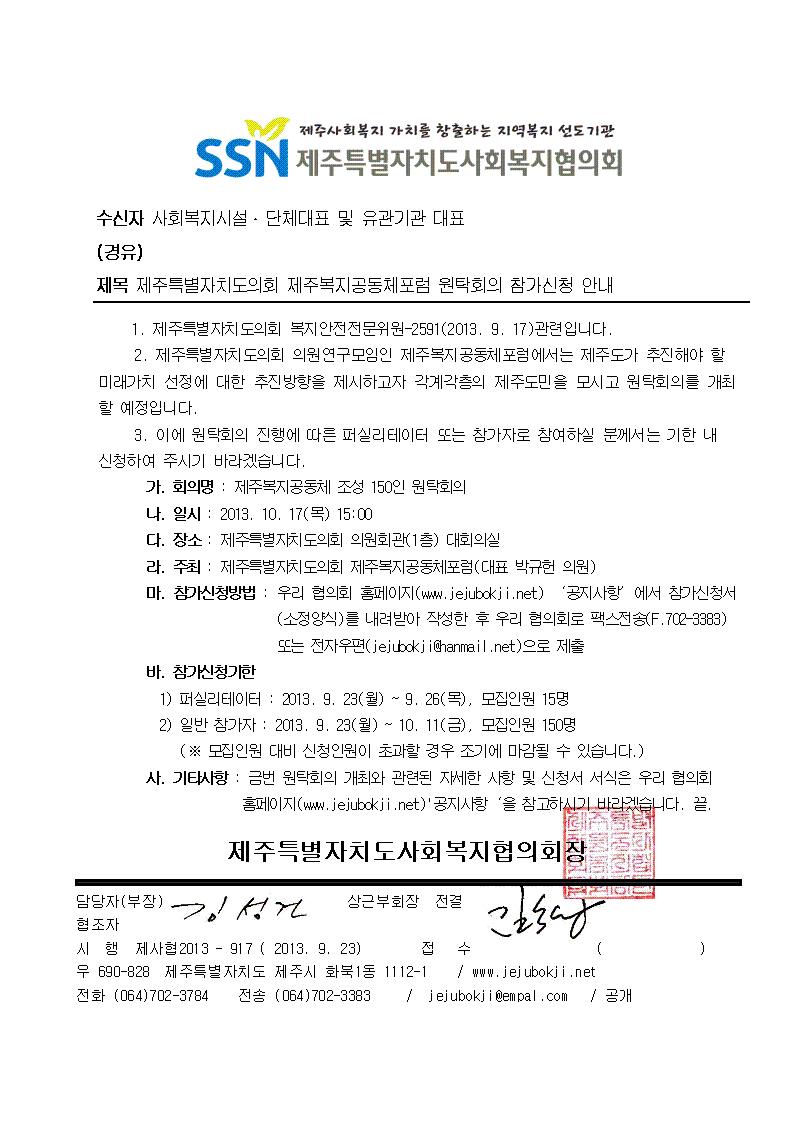 도의회 제주복지공동체포럼 원탁회의 참가신청 안내