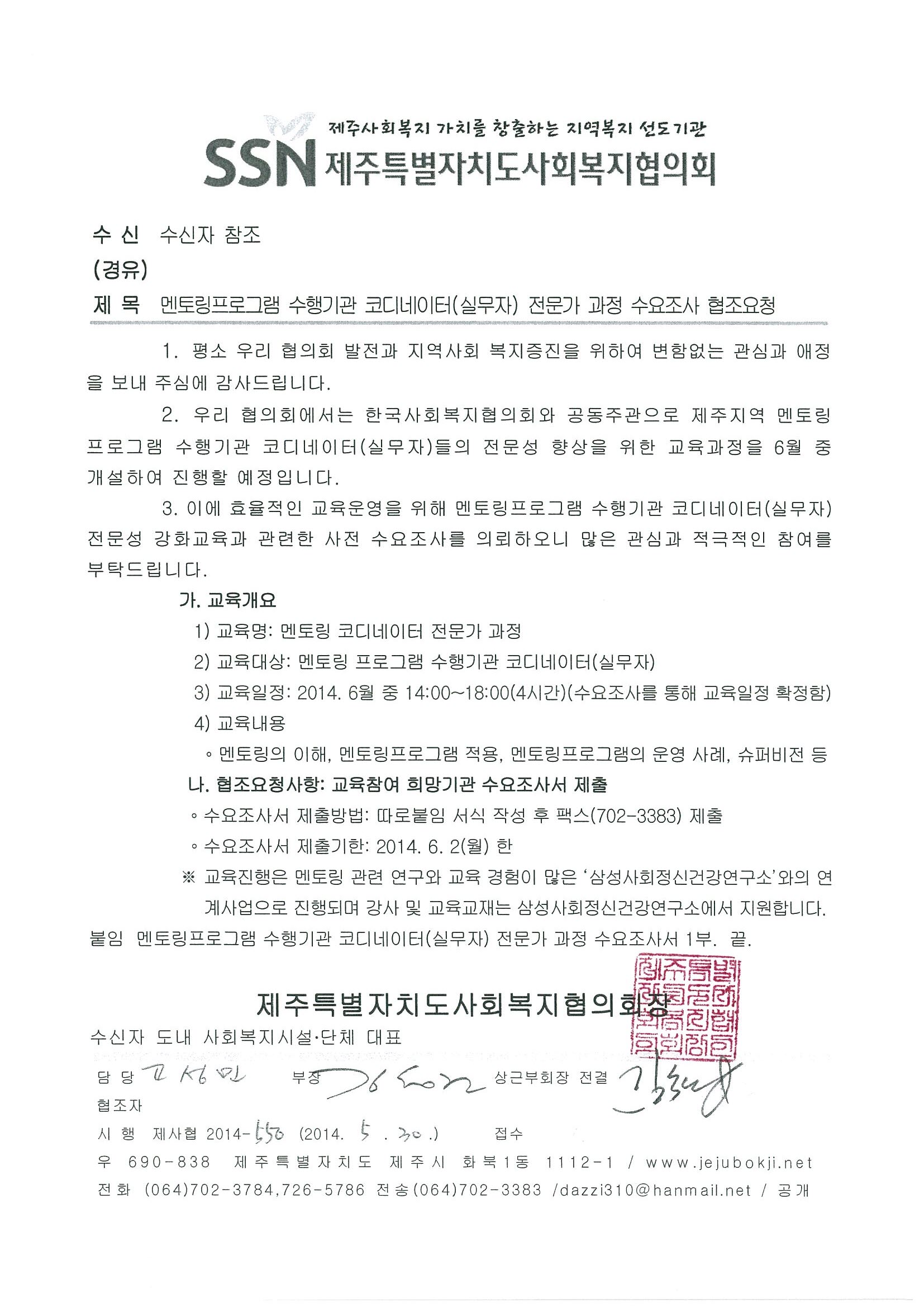 멘토링프로그램 수행기과 코디네이터(실무자) 전문가 과정 수요조사 협조요청