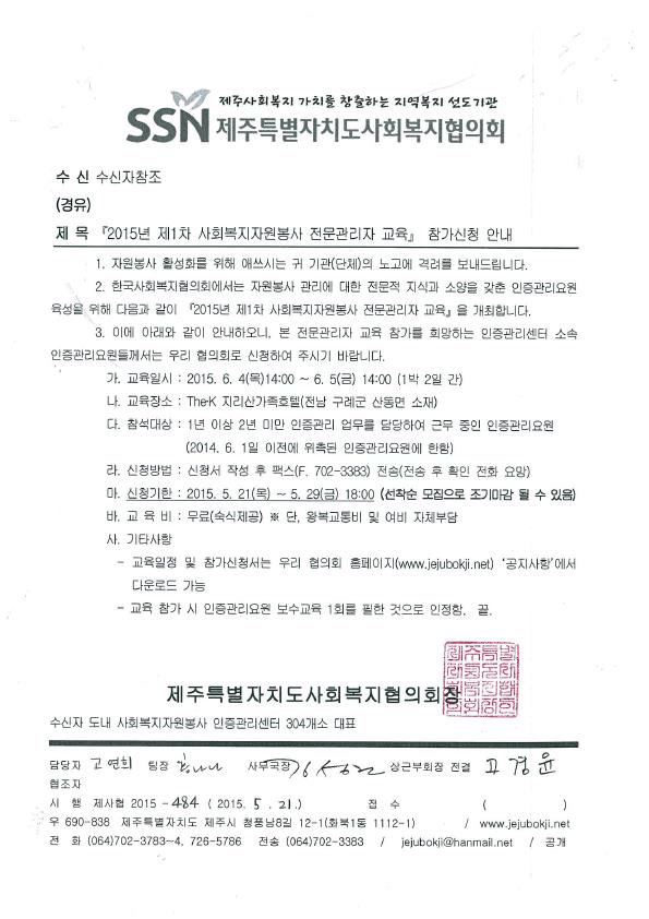 2015년 제1차 사회복지자원봉사 전문관리자 교육 참가신청 안내