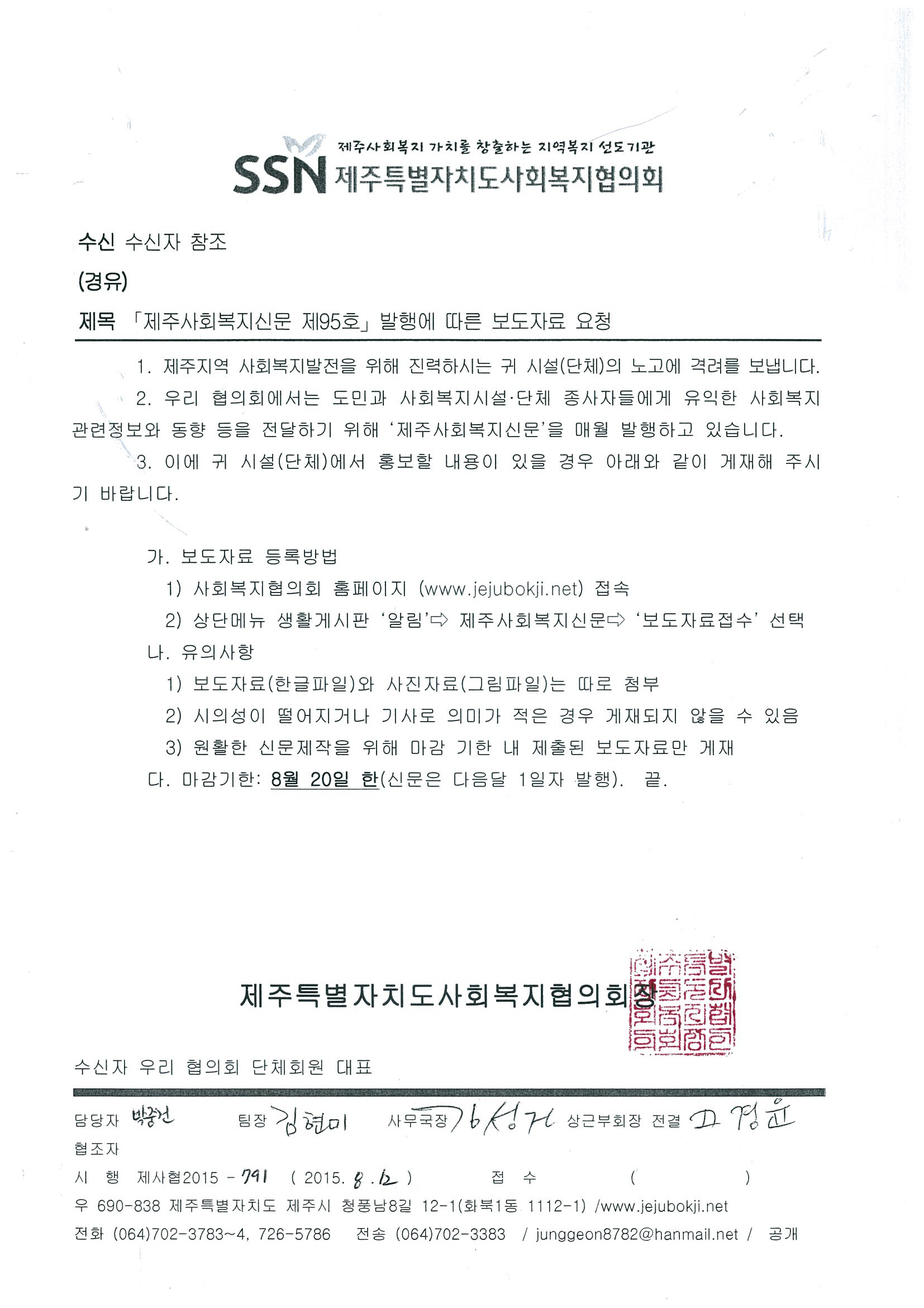 사회복지신문 95호 발행에 따른 보도자료요청 공문