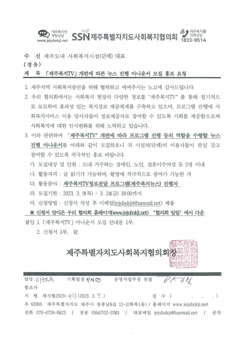 「제주복지TV」개편에 따른 뉴스 진행 아나운서 모집 홍보 요청