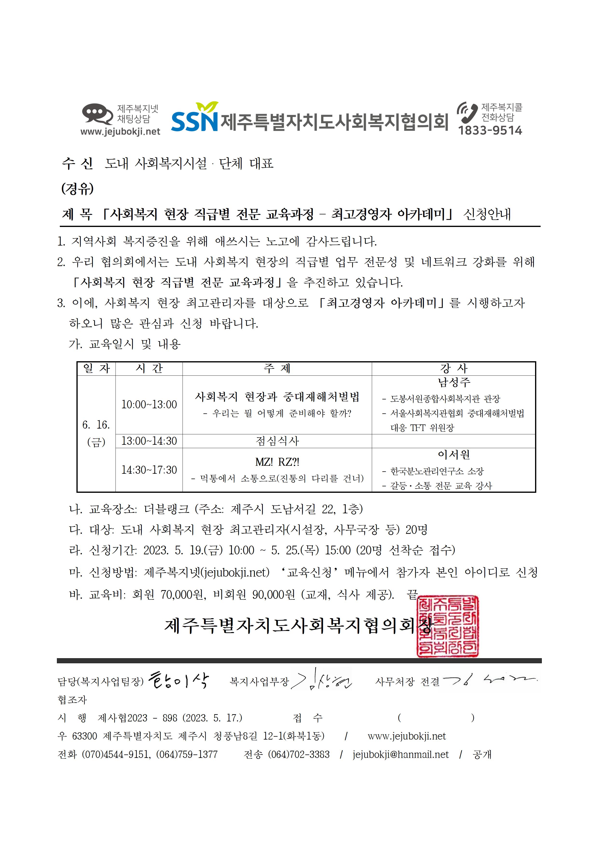 「사회복지 현장 직급별 전문 교육과정 – 최고경영자 아카데미」 신청안내