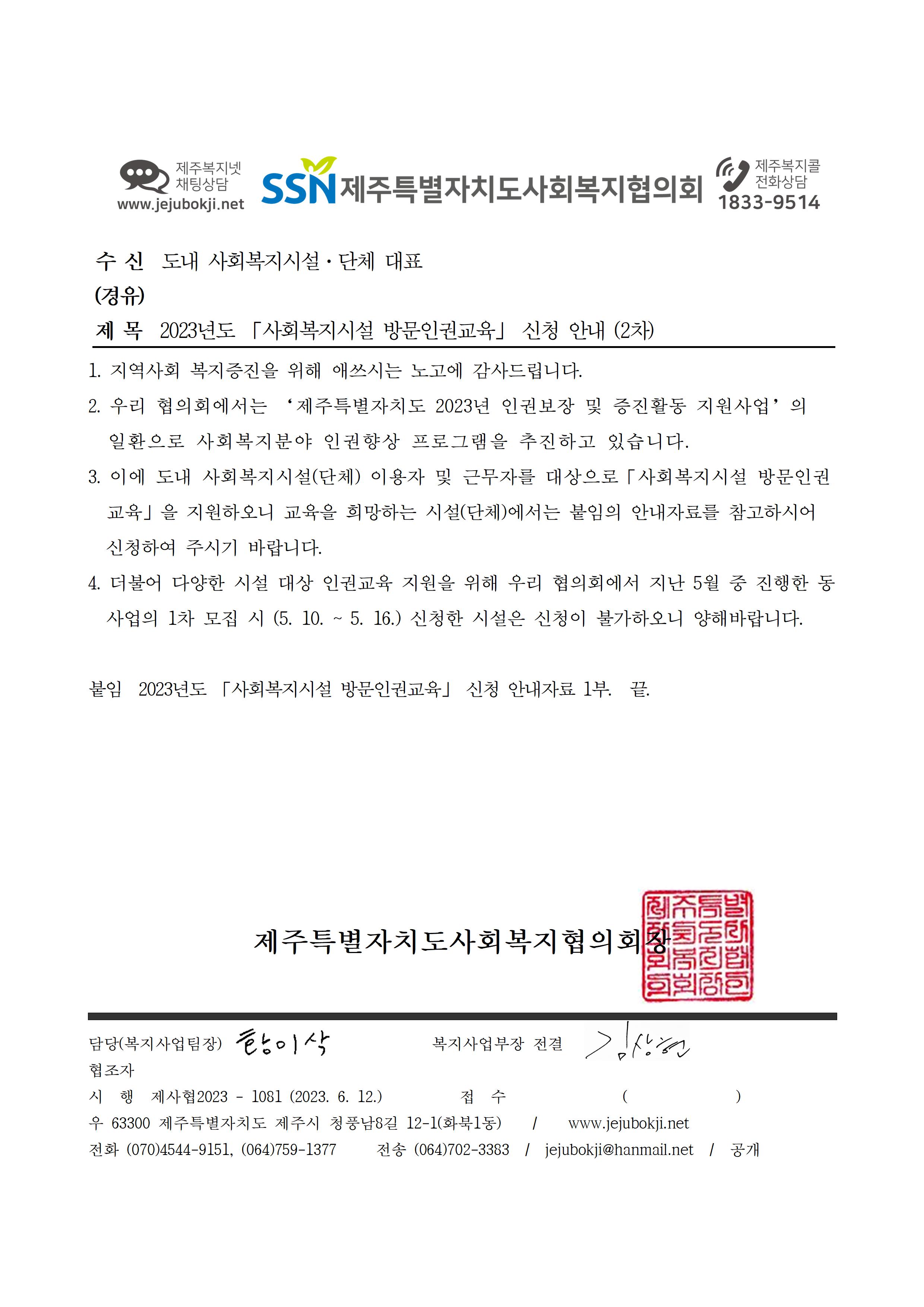 2023년도 「사회복지시설 방문인권교육」 신청 안내 (2차)