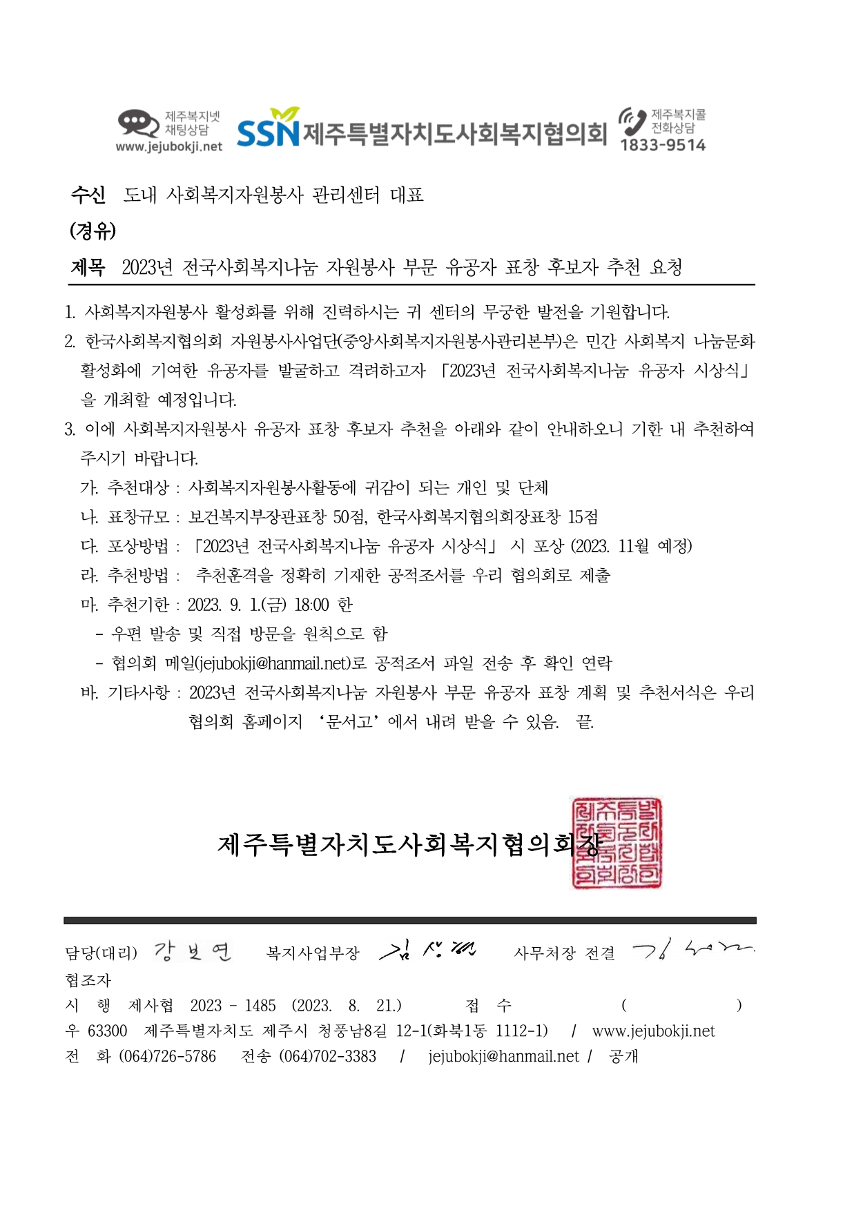 2023년 전국사회복지나눔 자원봉사 부문 유공자 표창 후보자 추천 안내