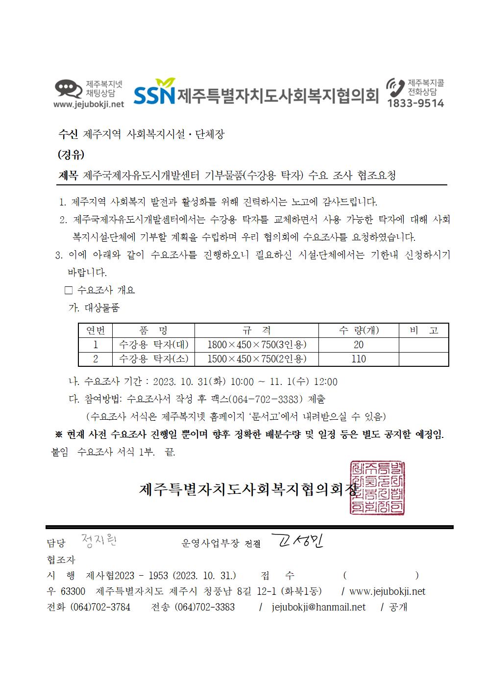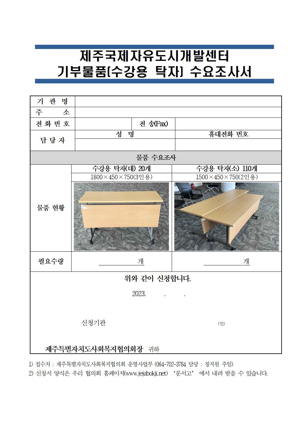 제주국제자유도시개발센터 기부물품(수강용 탁자) 수요 조사 협조요청