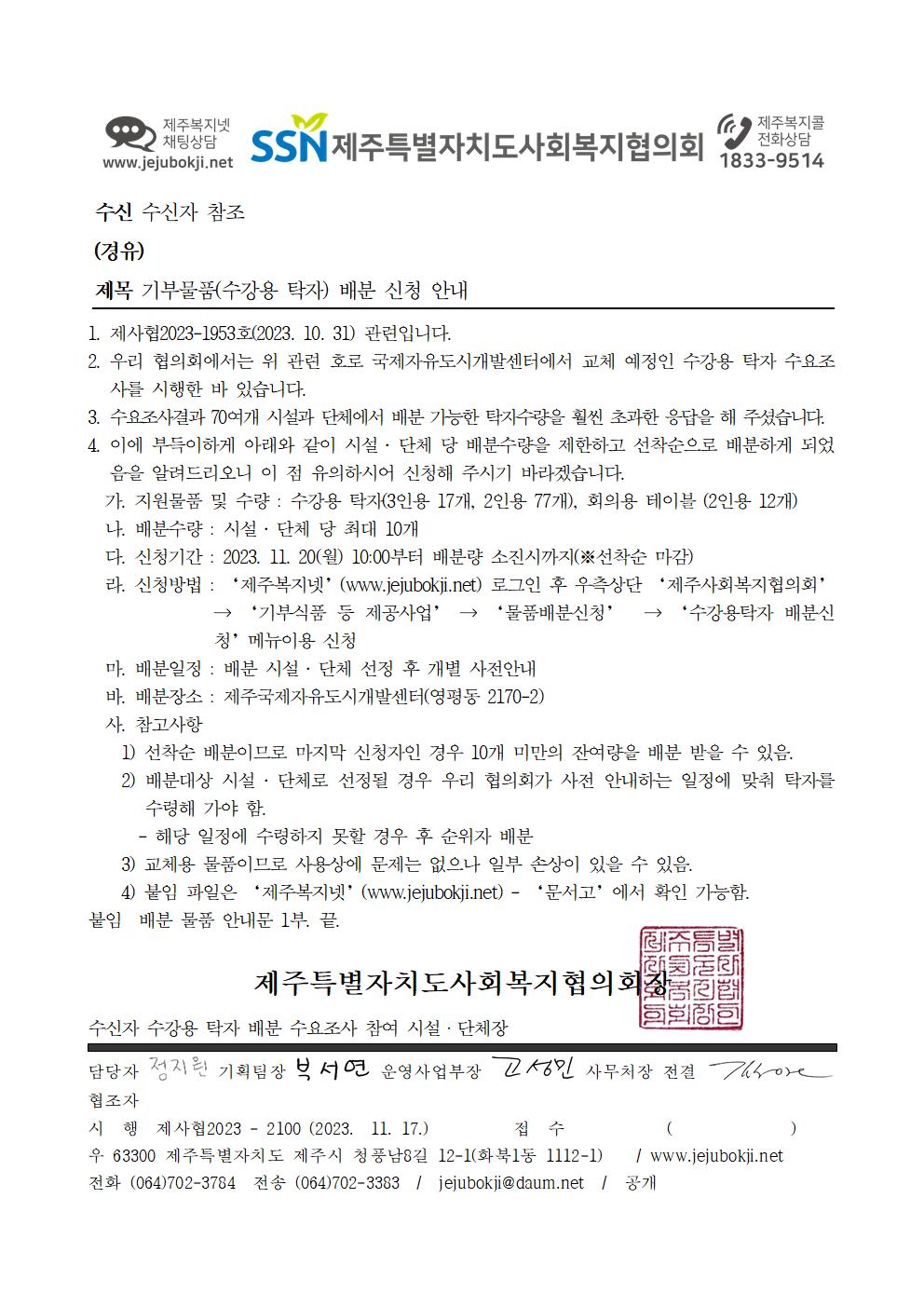 기부물품(수강용 탁자) 배분 신청 안내